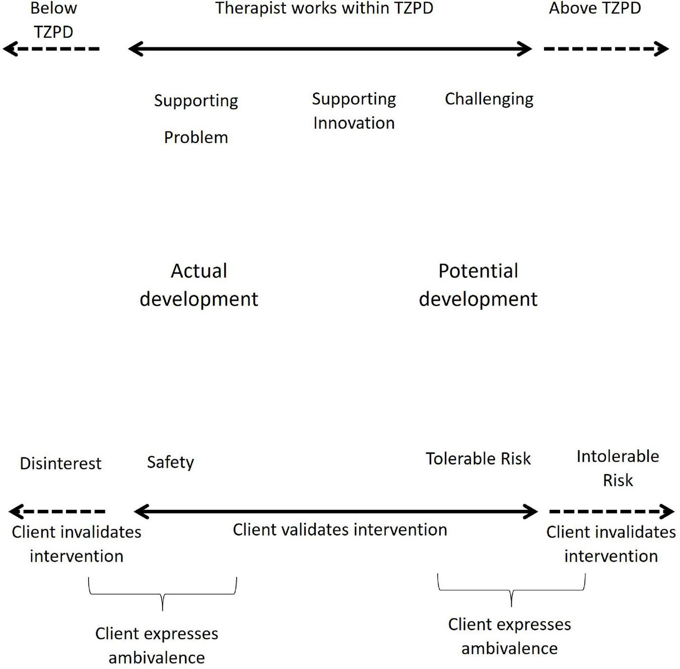 From this perspective, the dyad works collaboratively into the client’s TZPD, when the client validates the counselor interventions, either because these interventions support the client’s initial problematic narrative (a safety impact), or because the client feels potentially ready to change, supported by the counselors (tolerable risk impact). When the client invalidates the counselor’s intervention, they work non-collaboratively, outside the client’s TZPD. The clients may also respond with ambivalence when they simultaneously validate and invalidate the counselor in the same action.