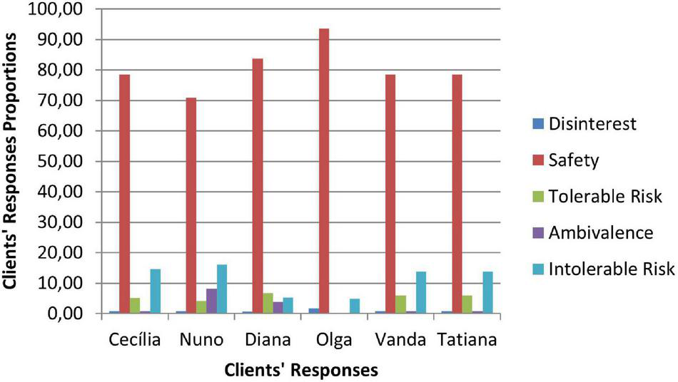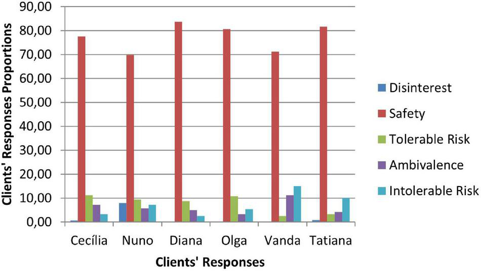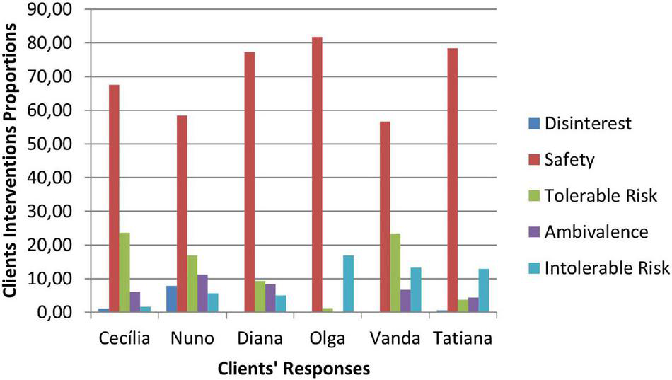 Clients’ responses are coded as disinterest, safety, tolerable risk, ambivalence and intolerable risk. Disinterest and Intolerable Risk responses correspond to invalidation responses. The difference between them refers to the development level of the clients at that time and the way clients respond to counselors. Safety and Tolerable Risk responses correspond to validation responses. Safety responses include confirming and giving information and refer to clients’ validation in their current development level. Tolerable Risk responses include extending and reformulating oneself perspective and refer to clients’ validation in their potential development level, when clients move forward toward change. Ambivalence is a response that includes a validation and an invalidation at the same time, in the same intervention.