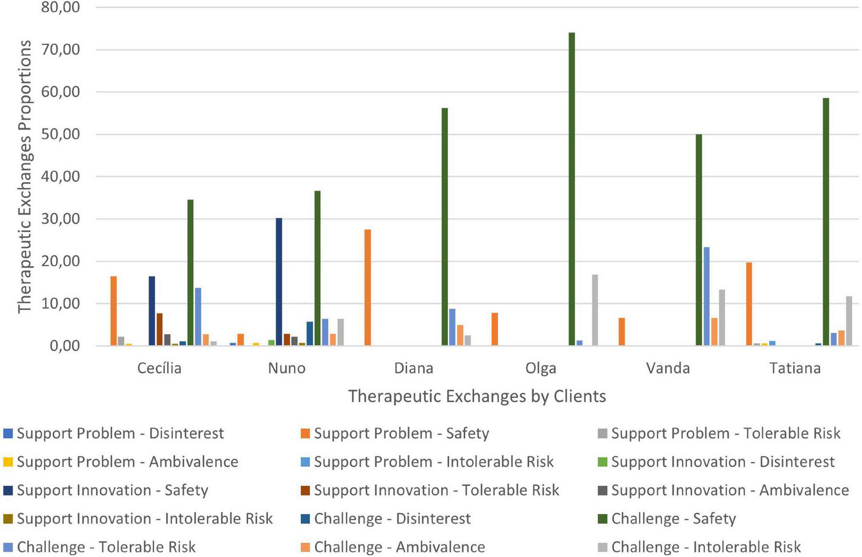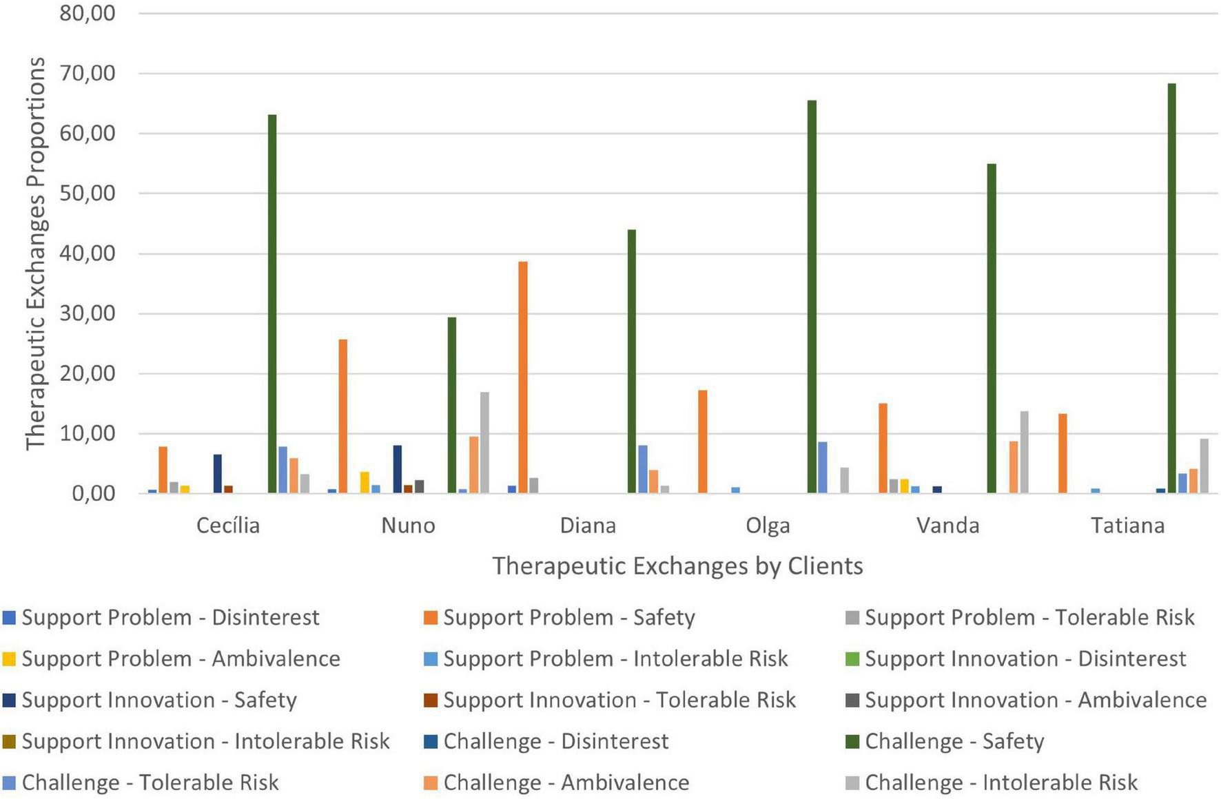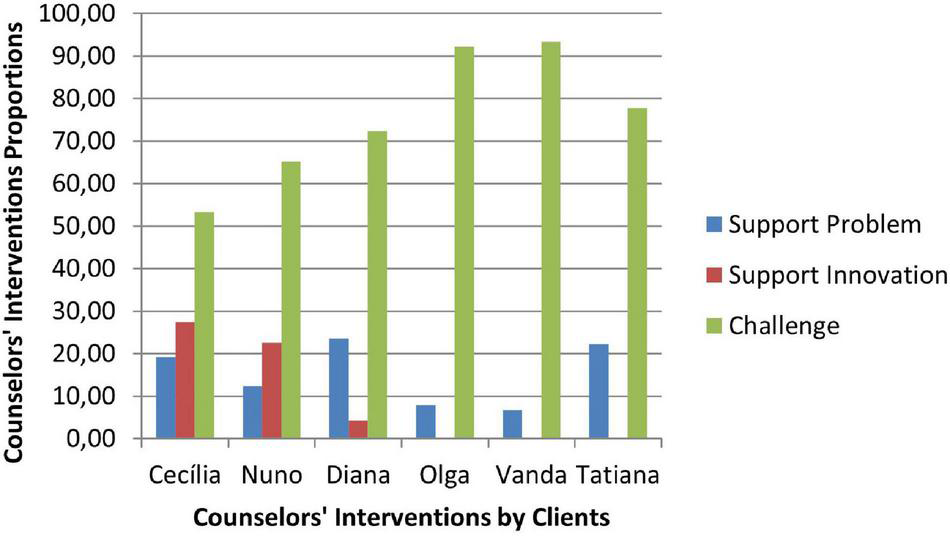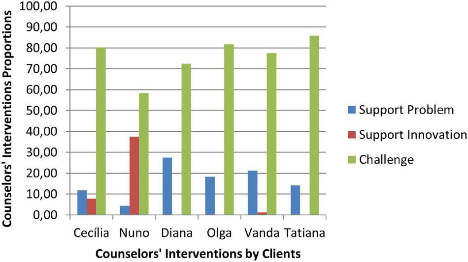 The sessions codification occurred according to the sequence of procedures of the TCCS manual (Ribeiro et al., 2016b): consensual definition of both judges about the problematic self-narrative of the clients, and of alternative or innovative narrative, individual codification of each counseling session for both judges, and agreement percentage computation and consensual discussion about disagreements. Eight sessions of four clinical cases were independently and sequentially coded until an 80% agreement percentage was obtained for both therapists’ and clients’ utterances. All the sessions of the six cases were coded and analyzed in this study. Cases Cecília, Olga, Vanda and Tatiana had three sessions and cases Nuno and Diana had four sessions.