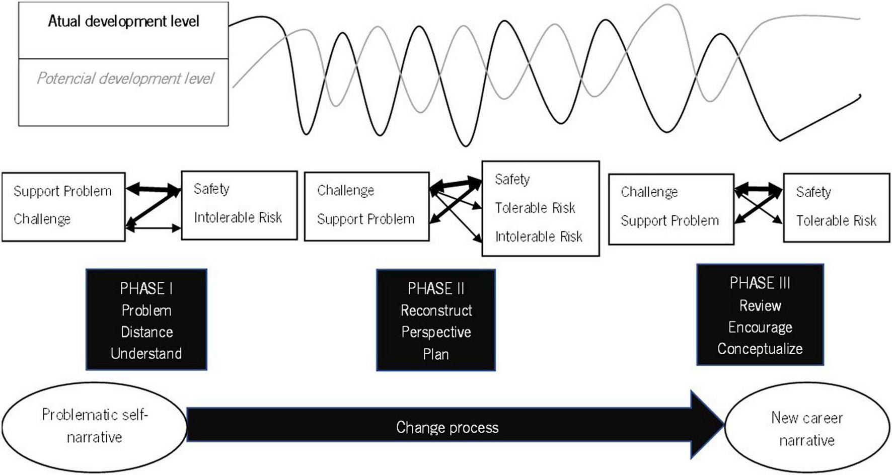 Drawing on the concepts of validation (Kelly, 1955) and proximal development zone (Vygotsky, 1978), Ribeiro et al. (2019) suggests that the therapeutic collaboration can be viewed as a mutual validation process along a developmental track of assisted change. According to this view, counselor and client are expected to use empathetic comprehension of mutual experiences in the counseling process. At the same time, they are supposed to achieve mutual understanding of the client’s actual difficulties, the recognition and amplification of the client’s resources and potential for change, as well as the co-construction of new meanings and possible opportunities for the client’s change. Accordingly, the TCM establishes that change occurs when counselors challenge clients to take a different perspective on the initial problematic self-narrative and make a new meaning about one’s own career story. In doing so, clients move toward their therapeutic zone of potential development (TZPD; Ribeiro et al., 2013, 2019). The TCM is presented in more detail in Figure 1.