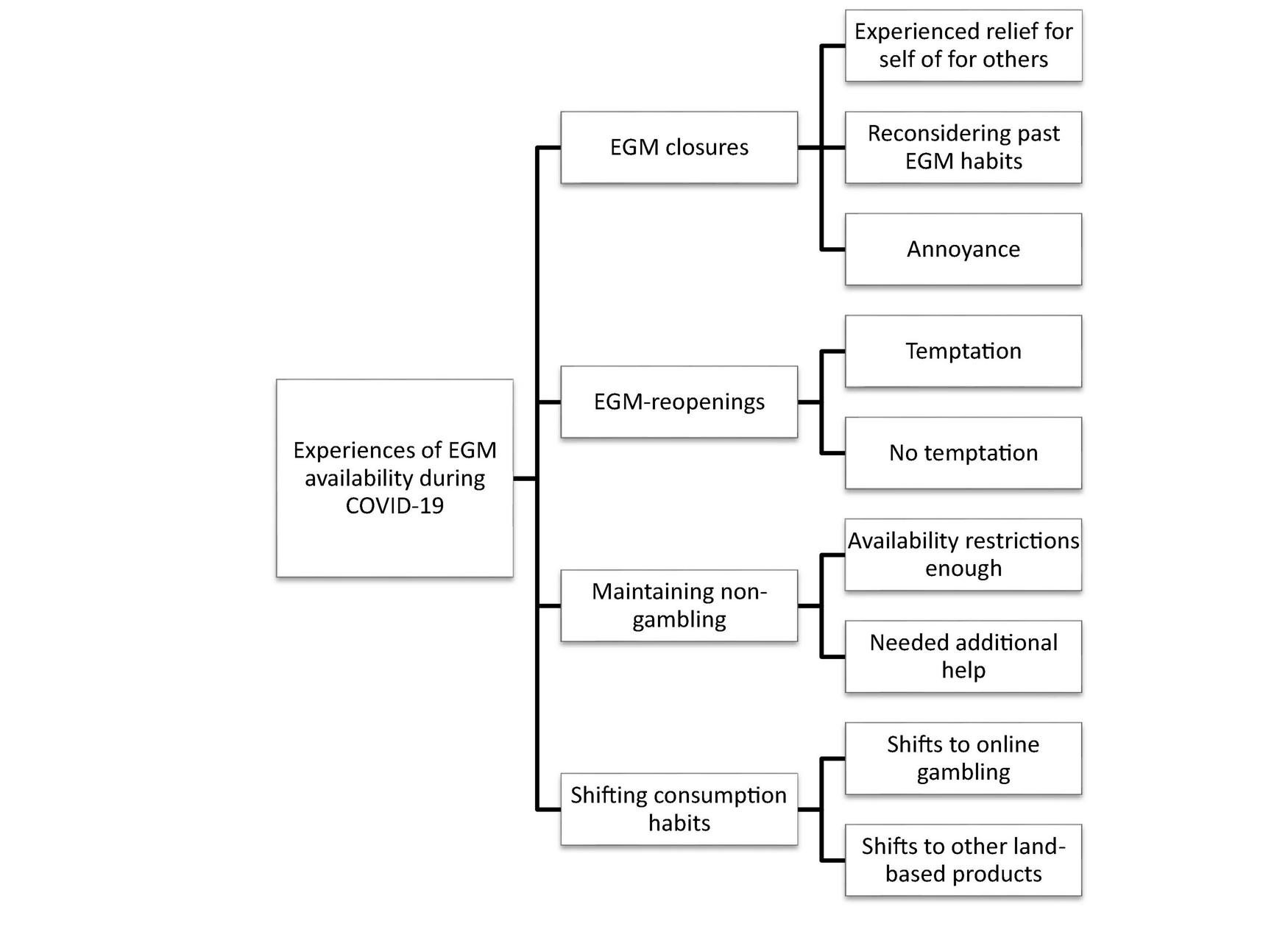 The results are presented in the following under four themes that correspond to the main categories in our deductive categorisation matrix (Table 3). The focus is on how the respondents experienced limited EGM gambling provision during the prolonged pandemic situation. The most discussed theme remained EGM closures. Re-openings were not discussed to a similar degree despite both questionnaires and interviews prompting respondents on both topics. This may be because during the time of data collection (early spring 2021) EGMs had again been closed in most Finnish regions to prevent the spread of the coronavirus. An overview of the main analytical categorisations of the analysis is presented in Figure 1.