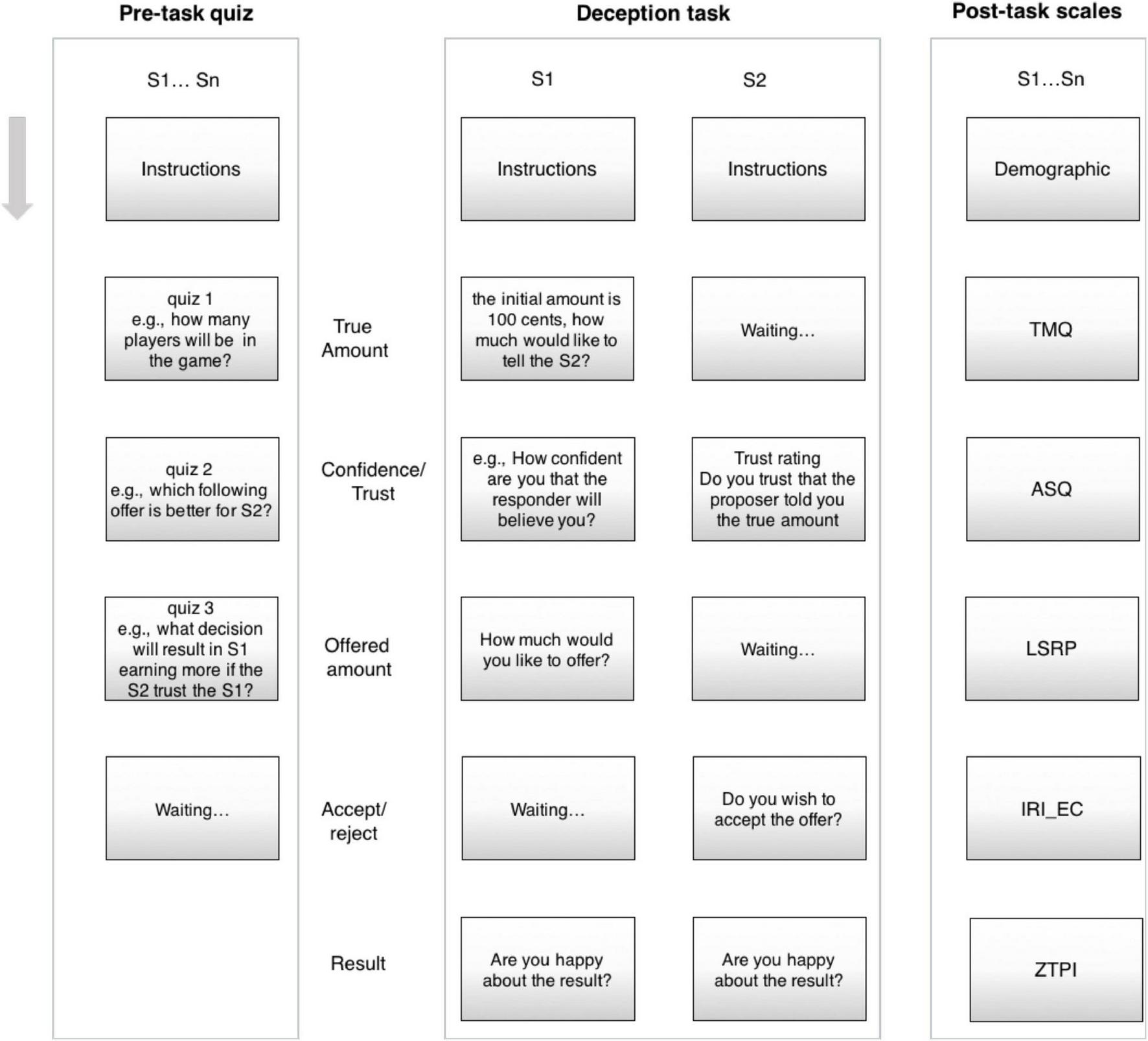 Two participants were randomly paired over internet and assigned a role of either proposer or responder. The participants were first shown detailed instructions about the task (Figure 3). On the next page, the endowment – randomly chosen from a range of 30–160 cents – was shown to the proposer. This amount was not shown to the responder. On the same page, the proposer was prompted to tell the responder how much this initial endowment was (Notably, the larger the initial endowment was, the more opportunity for deception in this phase of the task.). On the subsequent page, the proposer was asked to rate how confident they were that the proposer would believe the amount stated as the initial endowment. Simultaneously, the responder was asked to rate how much they trusted that the stated amount corresponded with the true endowment. Both of these ratings were on a five-point scale. Next, the proposer was prompted to actually offer a proportion of the initial endowment. On the penultimate page, the responder was prompted to either accept or reject this offer. Finally, the true initial endowment, the offered amount, and the payoff (based on the responder’s decision) were displayed on the screen, and both players were asked to rate how happy they were with the outcome on a five-point scale. The experiment was followed by questionnaires measuring mentalization (IMQ), psychopathy (LSRP), empathy (IRI_EC), time perspective (ZTPI), and autism traits (ASQ).