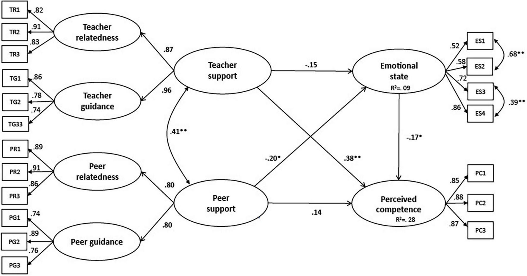 The data were analyzed with descriptive statistics using IBM SPSS version 27 (SPSS, 2021). The respective hypothesized relations between the latent variables of teacher support, peer support, students’ emotional states, and perceived competence were tested with a structural support model (SEM) using Stata 17 (StataCorp, 2021).