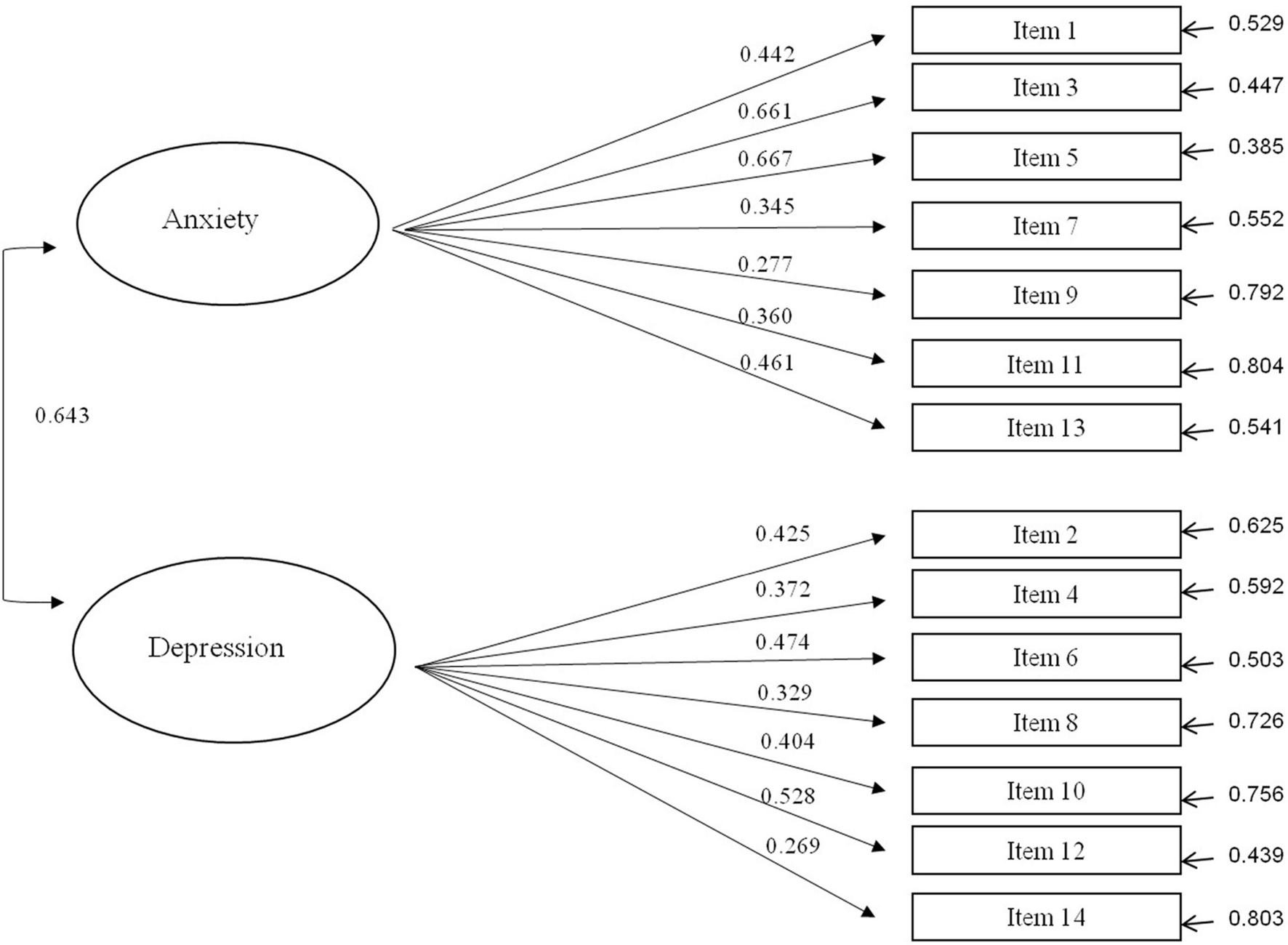 Path diagram for the confirmatory factor analysis of HADS with standardized regression weights.