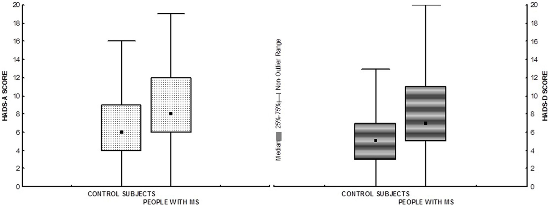 Box plots showing medians and interquartile range of HADS scores in pwMS and control subjects. HADS-A, HADS Anxiety subscale; HADS-D, HADS Depression subscale.