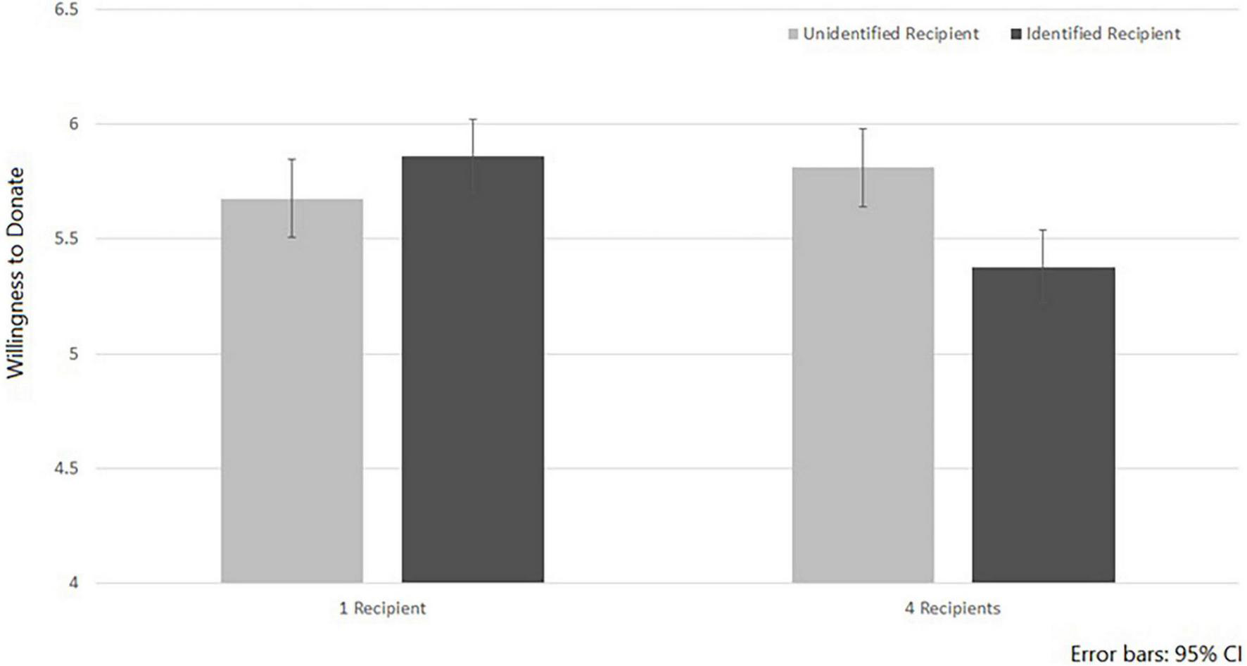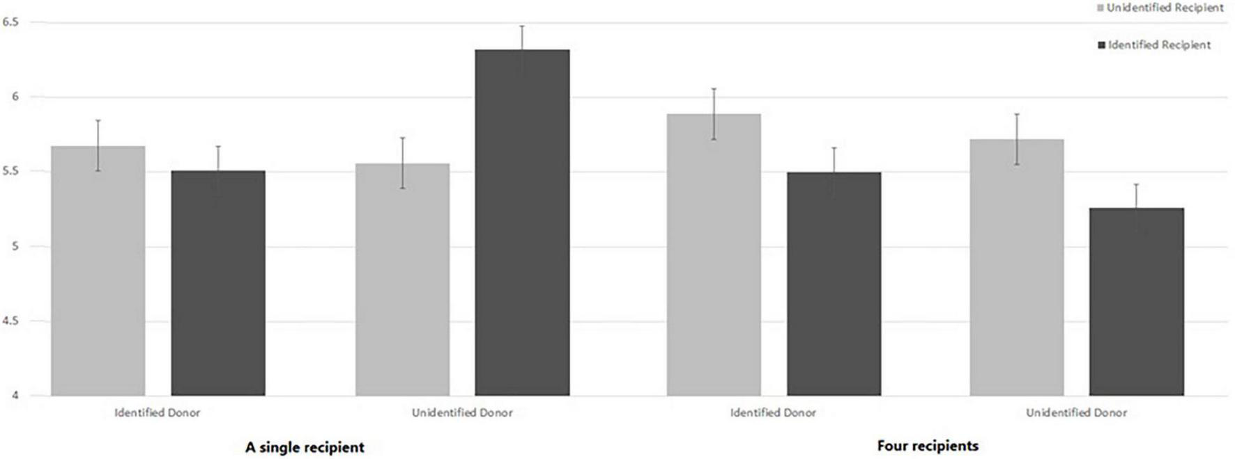 The interaction between Donor’s Identification and Number of Recipients was significant F(1, 295) = 5.77, p = 0.017, ηp2 = 0.02. As illustrated in Figure 1, replicating the results of Harel et al. (2017), simple effect analysis shows that when only one recipient was presented, participants who were told about an identified deceased donor (M = 5.53, SD = 1.67) were less willing to donate the organs of a deceased relative than those whose account talked about an unidentified donor (M = 5.94, SD = 1.44); F(1, 295) = 6.09, p = 0.014, ηp2 = 0.02. However, when four recipients were saved by the organs of the one deceased donor, identifiability of the donor had no significant effect on willingness to donate—F(1, 295) = 0.85, p = 0.36, ηp2 = 0.003. This suggests that knowing about several people who were saved by the organs of a single dead donor attenuates the effect of Donor’s Identification in reducing support for organ donations. However, reading about four people who were saved by the organ donation did not have a significant effect in increasing WTD.