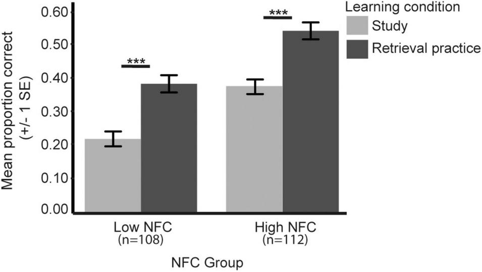 Despite the well-established learning effects retrieval practice has on long term retention, (i.e., the testing effect), less is known about its effect related to individual variations in need for cognition (NFC; Cacioppo et al., 1996). NFC is a personality trait and is defined as “differences among individuals in their tendency to engage in and enjoy thinking” (Cacioppo and Petty, 1982, p. 116). High levels of NFC have a positive impact on performance (Weissgerber et al., 2018) and school grades (Grass et al., 2017; Luong et al., 2017; Strobel et al., 2019). Whereas some evidence exists for a positive link between NFC and cognitive ability (e.g., Fleischhauer et al., 2010; Hill et al., 2016), others have proposed that there is no such relationship (e.g., Gärtner et al., 2021). For example, Gärtner et al. (2021) suggest that NFC is a trait that is less characterized by cognitive abilities per se, instead they rather stress that the degree of NFC is related to the willingness to invest effort and self-control in the task at hand (see also Sandra and Otto, 2018). Related to NFC, prior behavioral studies have reported that students with lower NFC have a tendency to prefer learning strategies characterized by surface rather than deep learning (e.g., Evans et al., 2003; Sandra and Otto, 2018), or lack engagement in cognitively demanding learning activities (e.g., Gärtner et al., 2021). Moreover, Gonthier and Roulin (2020) further provide evidence that individuals with lower levels of working memory capacity and NFC are more inclined to use less effective learning strategies given the task at hand (see also Evans et al., 2003 for related findings). As such, one challenge within the educational field is to identify and examine whether specific learning methods can reduce the influence intrinsic motivation to spend low cognitive effort on a given task has, and in turn boost learning and retention in individuals with lower NFC. One possible learning method for this purpose could be retrieval practice.