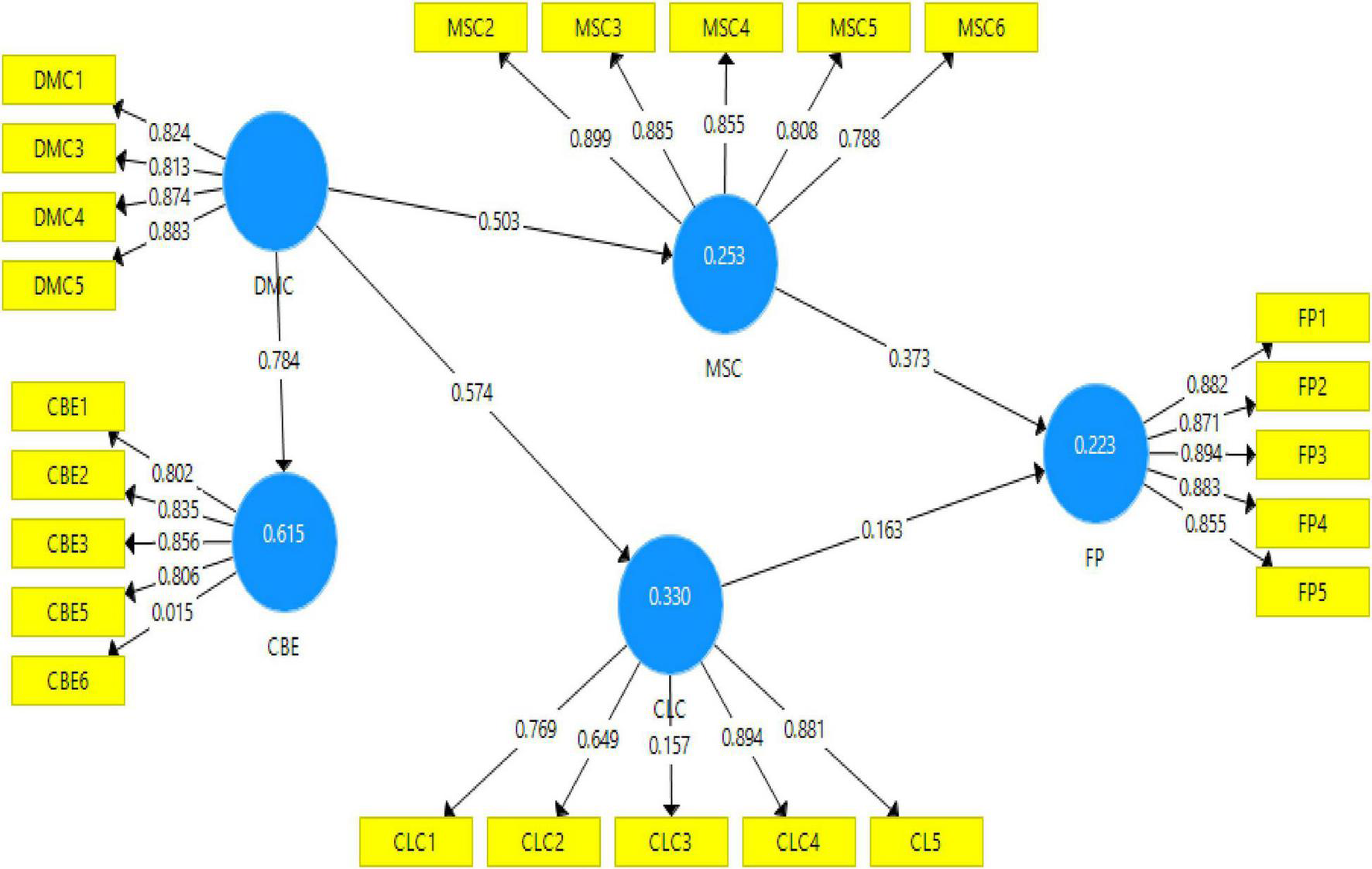 In this study, a 5-point Likert scale was used to measure the items. DMCs were measured with six items adopted by Wang (2020). CBE was measured with six items adopted by Hollebeek et al. (2014). MSCs were measured with six items adopted by Lindblom et al. (2008). CLCs were measured with five items adopted by Cao and Tian (2020), and firm performance was measured with five items (Croteau and Bergeron, 2001; Kearns and Sabherwal, 2006).