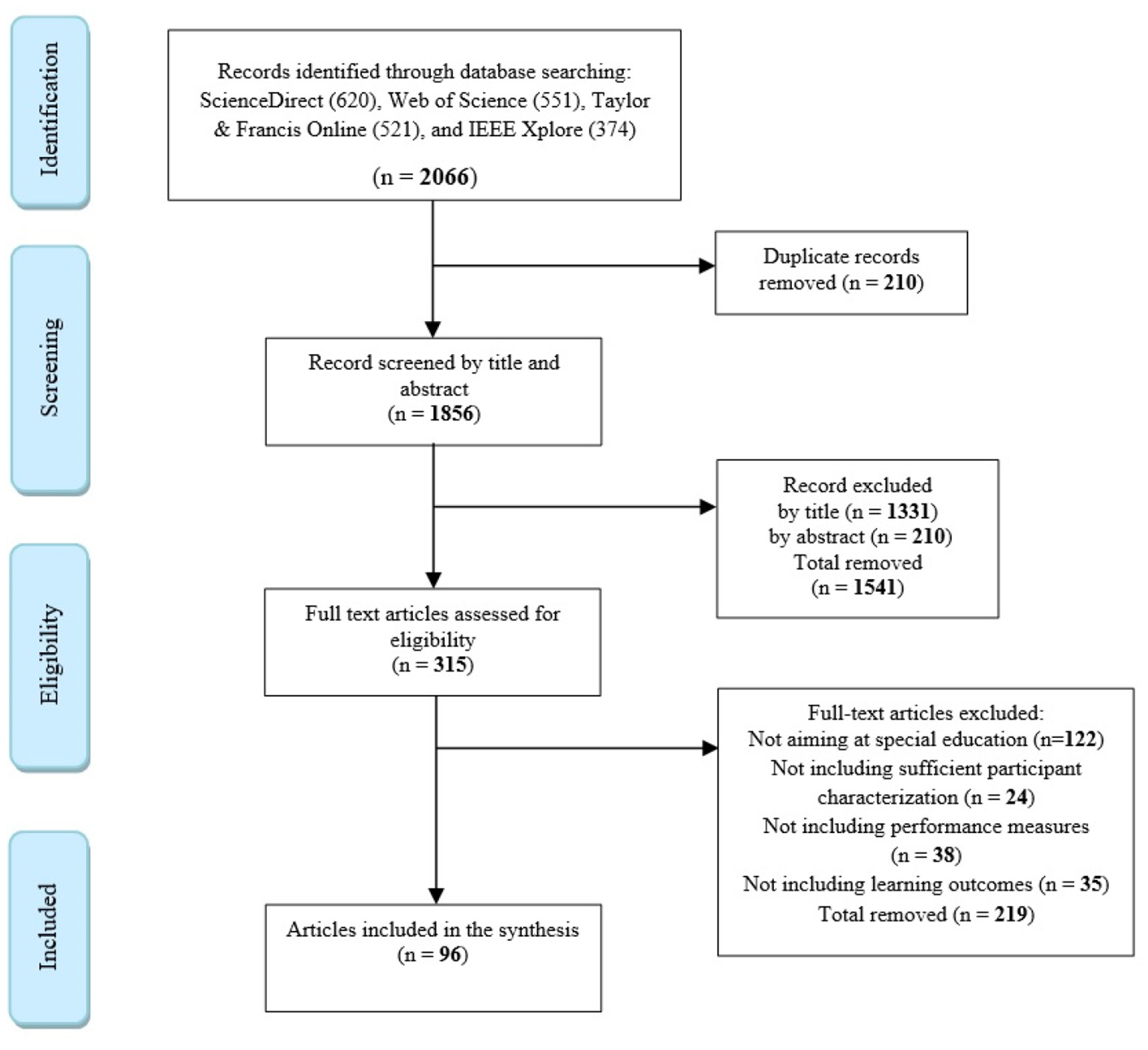 This research yielded a total of 2,066 articles. After removing duplicate papers, 1,856 papers remained. A total of 1,541 papers were then removed after screening titles and abstracts. The remaining 315 papers were considered and assessed as full texts; 219 of these papers did not pass the inclusion criteria. Thus, a total of 96 studies were eligible for further analysis. Figure 1 presents the study selection process as recommended by the PRISMA group (Moher et al., 2010). Finally, based on the degree of agreement between the choices made by the two independent authors in selecting papers, Cohen's kappa was calculated to test inter-rater reliability. According to Cohen (1960), the obtained inter-rater reliability was strong (κ = 0.88); in case the assessment score was different, agreement was reached through discussions.