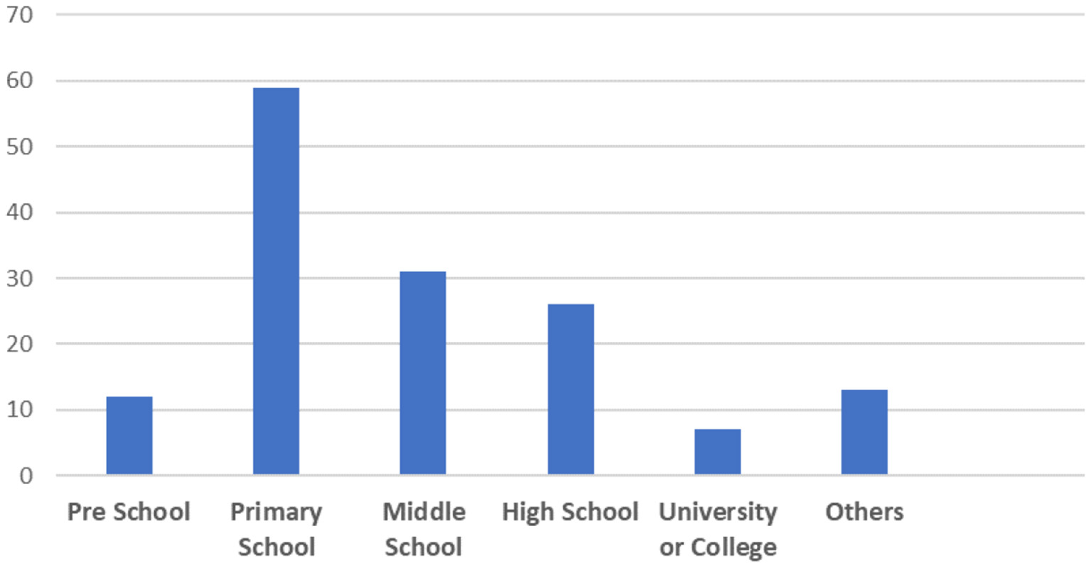 Based on the analysis of the collected studies, Figure 3 presents the distribution of studies by education level. Of these, 12 focused on learners in preschool (e.g., RuŽičková and Hordějčuková, 2015; Al Mahmud and Soysa, 2020), 60 involved learners in primary school (e.g., Hulusic and Pistoljevic, 2012; Bernardini et al., 2014), 32 had learners in middle school (e.g., Hetzroni and Banin, 2017; Sari et al., 2019), 27 had learners in high school (Hollingsworth and Woodward, 1993; Sherrow et al., 2016), seven focused on learners in colleges or universities (e.g., Cano et al., 2019) and thirteen were classified as “others” because they examined learners who were not in school/university (e.g., Segatto et al., 2017) or did not specify learners' education level (e.g., Rahmadiva et al., 2019). It should be noted that 32 studies involved learners in more than one education level. For instance, 17 had learners in primary school, middle school and high school (e.g., Bouzid et al., 2016).
