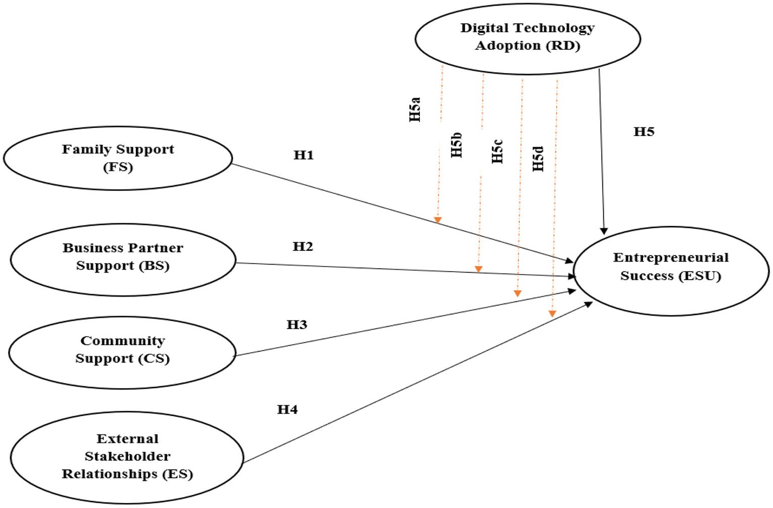 H5: The positive associations of (a) family support, (b) business partner support, (c) community support and (d) external stakeholder relationships with entrepreneurial success are moderated by digital technology adoption so that these associations are stronger at higher levels of technology adoption