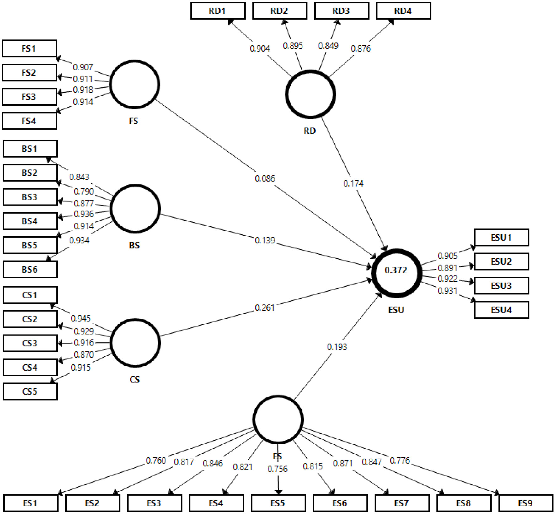 Figure 3. Structural model. BS, Business partner support; FS, Family support; CS, Community support; ES, External stakeholder relationship; ESU, Entrepreneurial success; RD, Digital Technology adoption.