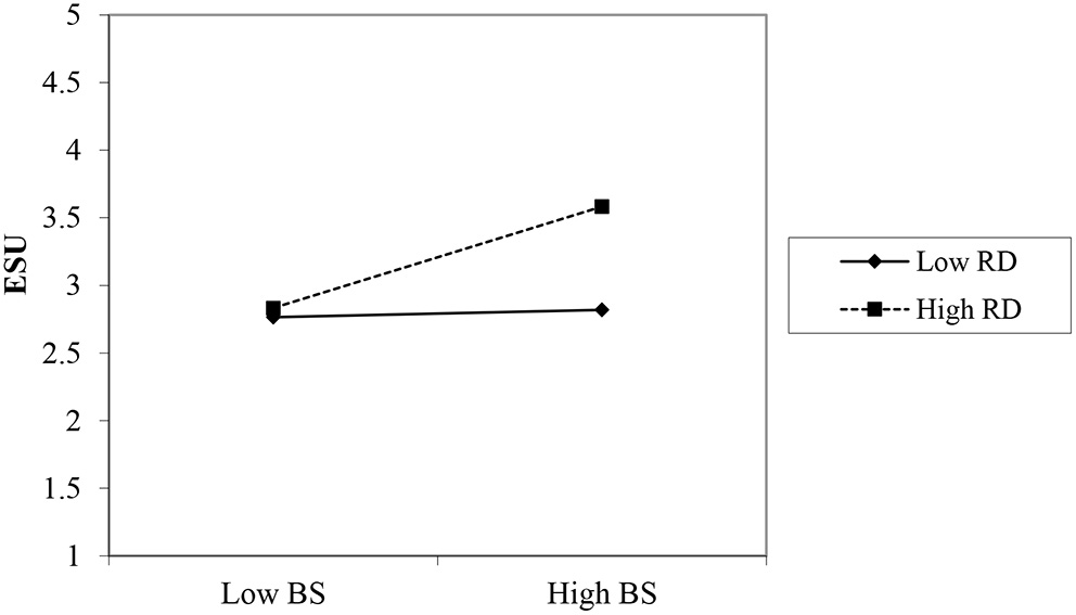 Figure 2. Conceptual model. BS, Business partner support; FS, Family support; CS, Community support; ES, External stakeholder relationship; ESU, Entrepreneurial success; RD, Digital Technology adoption.