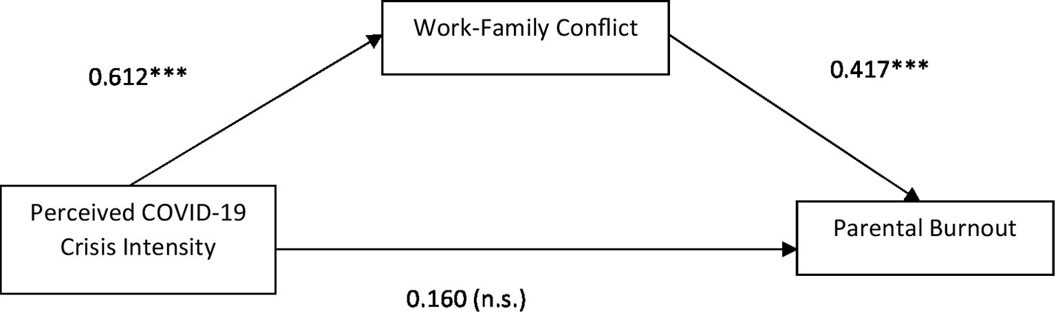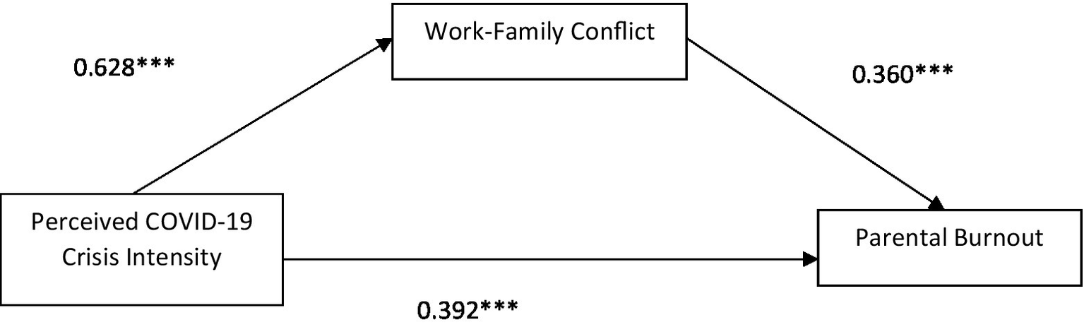 Perceived Covid-19-Crisis Intensity (PCCI) and Family tensions related to diverging attitudes concerning infection and precaution measures (VIPM) may not only directly elicit parental burnout through anxiety and psychological distress as a response to the novelty, unpredictability, threat and lack of control the pandemic brings along, but also indirectly, as both PCCI and VIPM may evoke increased role conflict between parents work and family demands. For most knowledge workers, the Covid-19 pandemic meant an abrupt change to (mandatory) full-time remote work, (Carnevale and Hatak, 2020; Ghislieri et al., 2021), for those workers whose work could not be transformed to remote working it often meant substantial -and stressful - health precaution measures at work. In many instances they quickly needed to adapt to new circumstances at work, while at the same time, they had to devote more time and energy to their children, due to the closure of schools and centers for childcare (Carnevale and Hatak, 2020). Parents thus often had to manage increased demands in the work and family domain simultaneously. From role theory it can be argued that participating in multiple roles may lead to inter-role conflict, as it becomes harder to fulfil multiple roles successfully due to competing demands or discordant behaviors among roles (Roy et al., 1965). Work–family conflict is a particular type of inter-role conflict that originates from simultaneous incompatible demands stemming from both the family and the work domain, leading to compromised effectiveness in either one or both roles (Greenhaus and Beutell, 1985). Specifically, conflict might occur when the amount of time and energy devoted to one role is limited due to the high demands associated with the other role (time-based and energy-based conflict), when stress arising in one role is transferred to the other role, this causes strain symptoms (strain-based), and/or when behaviors that are effective in one role are inappropriately enacted in the other role (behavior-based; Greenhaus and Beutell, 1985; Greenhaus et al., 2006). Particularly when boundaries between domains are blurred, work–family conflict is more likely to occur (Hunter et al., 2019). The Covid-19 pandemic made the boundaries of the domains of work and family blur in many ways, hence making work–family conflict more likely.