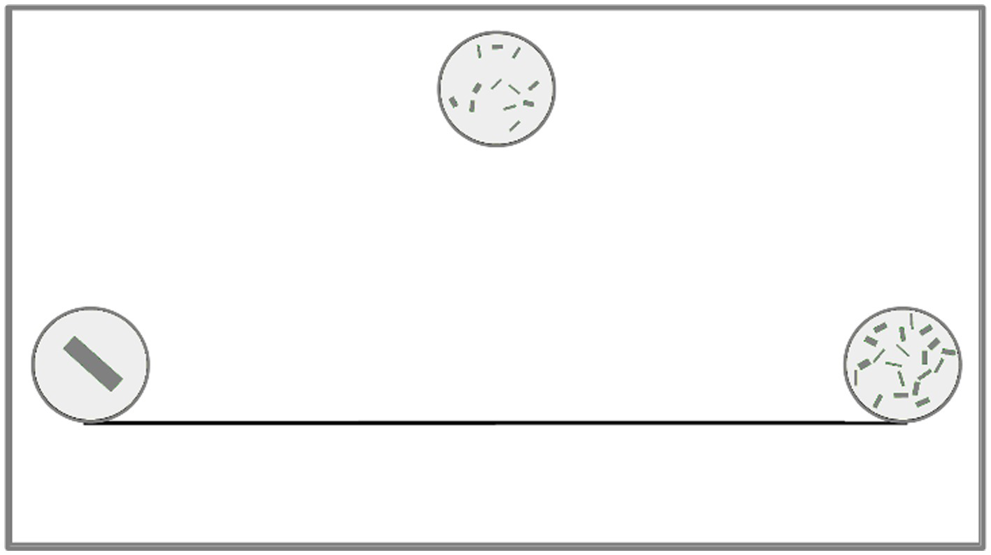 The procedure started with three training series. At the beginning, a screen was displayed containing a black line, 1,160 pixels long and 8 pixels thick, extending horizontally at 25% of the screen’s height. At its ends, two circles (diameter 163 pixels) containing 1 and 40 elements were displayed. The child was told a story about a boy/girl (Ann or Tom, depending on the participant’s gender) who places plates with cookies (circles containing sets of rectangles) on the table (line) so that on one side there are the fewest cookies and on the other side the most cookies. Then, centrally at the top of the screen, a new set (“cookie plate”) of 10, 20, or 30 elements appeared and the child was asked to show where the protagonist should put this plate. The experimenter confirmed the choice or, if the child indicated the wrong line segment (an error of over 25%), explained, with reference to the sets at the ends of the line: “There are more than here, but less than here, so we’ll move the plate a little closer to there.” The circle was moved to the correct position (according to the linear scale) and another “plate” appeared above the line, with the previous plate persisting on the screen. The whole procedure was repeated two more times, except differing in that when an incorrect line segment was indicated by the participant, the experimenter referred to the nearest two sets, regardless of whether they were the end-points.