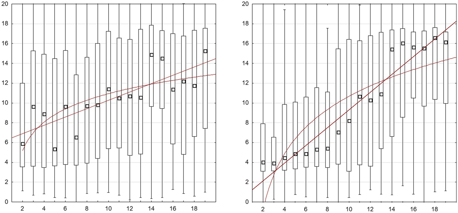 Next, we checked whether some multi-segment models explained the obtained data better than a homogeneous linear or logarithmic model. First, we took into account that the estimation of the units near the ends of the lines may differ from the middle part. In the case of small numerosities, this may be due to the separate mechanism of perception of small numbers. Numbers in the range 1–4 can be accurately identified by a subitizing mechanism independent of the ANS. Moreover, the relatively large diameter of the “plates” could cause the children to place the numbers at the ends of the tested range in such a way that they do not overlap with the “plates” marking the ends of the line, which leads to flattening the estimates at both ends. A visual inspection of Figure 2 may suggest such a pattern, so we decided to check if the middle line segment (5–16), with excluded extreme numerosities, would better fit any of the tested models than the entire range. Contrary to this hypothesis, the fit coefficients based on median estimates were in each case significantly lower than for the entire range. Even though the estimation of near-line end numerosities was a bit disturbed, the children seem to use a constant estimation function rather than separate scales for the middle and end line segments. Nevertheless, the linear model still significantly prevails over the logarithmic model for at least the entire sample and CP-knowers (see Table 1 for detailed data).