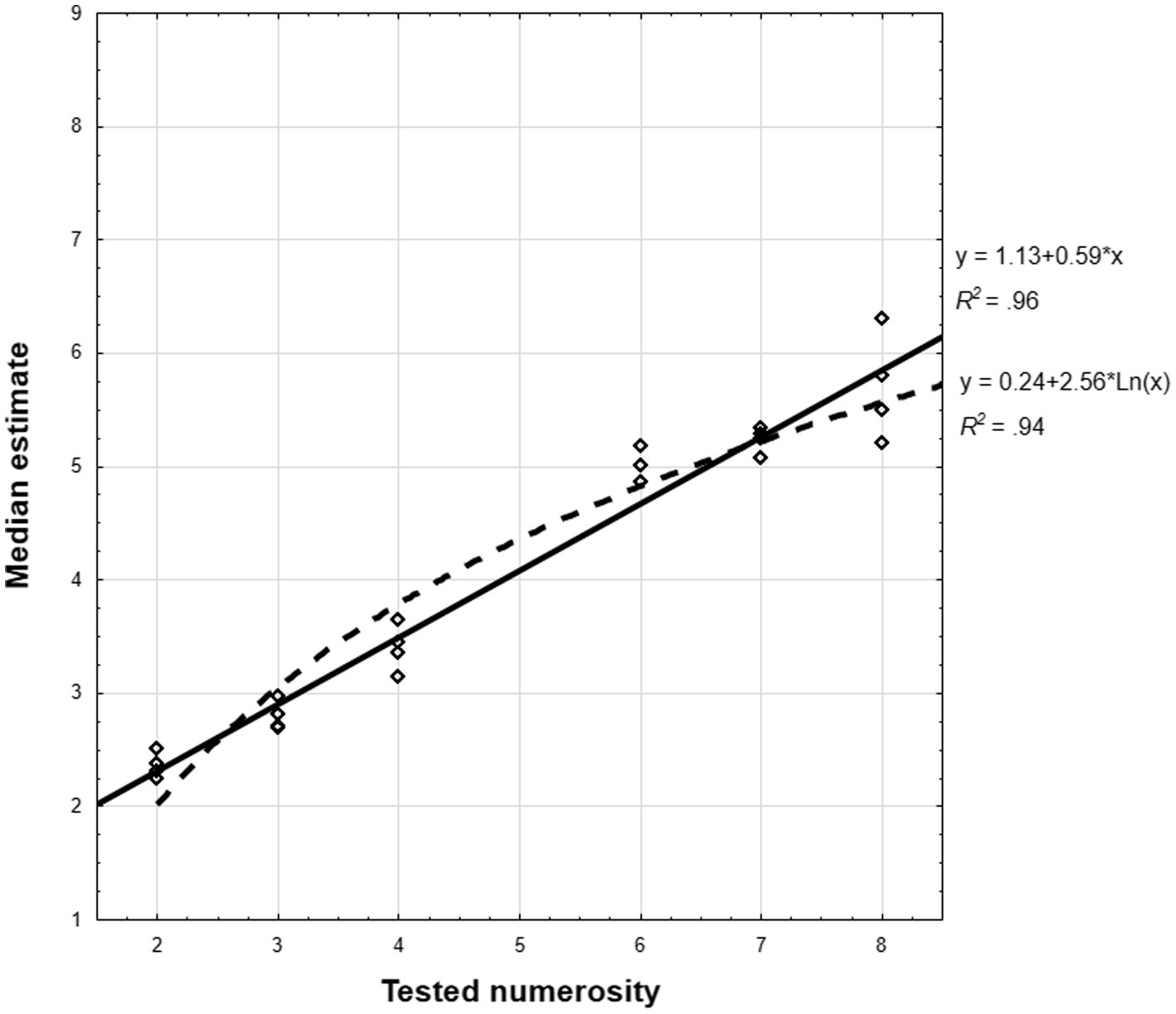Taken together, all results up to now attest to the fact that even subset-knowers reveal a certain level of regularity in their estimations of the position of sets’ numerosities on a number-line and that the linear model generally explains this regularity better than the logarithmic or cyclic power models.