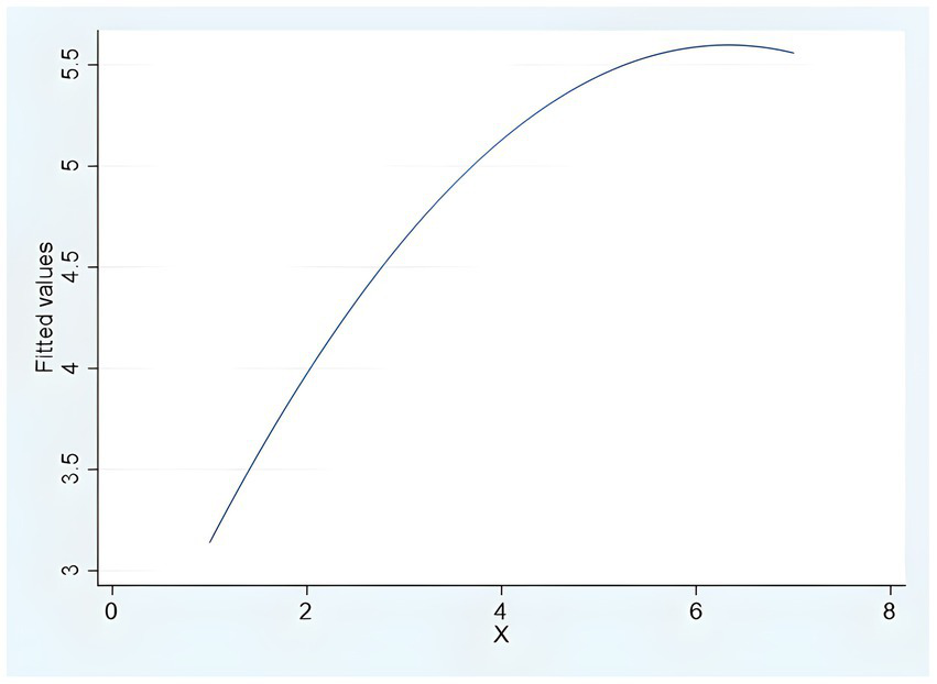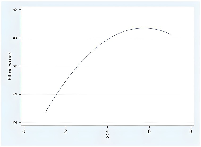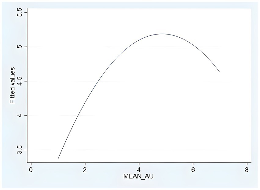 Next, we verify the inverted U-shaped relationship presented by the influence of algorithmic decision autonomy on consumer purchase decisions. First, the regression estimation of the curve was fitted by SPSS 26, and the results showed that the quadratic and primary terms standardized regression coefficients of β2 = −1.213 (t = −2.757, p = 0.007) and β1 = 1.427 (t = 3.243, p = 0.001) were significant, while the cubic curve fitting was not significant, proving that the non-“S” curve and the inverted U-curve relationship regression equation can be obtained: y = −0.122 (x2) + 1.187x + 2.311. Second, the independent variable was squared and included in hierarchical regression, and Model 3 in Table 1 shows that the square of decision autonomy (β2 = −0.142, p < 0.01) is significantly and negatively related to the purchase decision. However, Haans et al. argue that significant coefficients alone are not sufficient to establish a quadratic relationship (Haans et al., 2016). Therefore, using their research methods on inverted U-shaped curves for reference, we use Stata to carry out the standardized “U” test (the fitted Figure 2 is as follows). The algorithmic decision autonomy ranges from −1.993 to 1.759, when at −1.993, the slope is 1.133, which is positive; at 1.759, the slope is −0.633, which is negative. After calculation, the turning point is 0.414, which is within the range of the algorithmic decision autonomy. Therefore, the hypotheses of H1a, H1b, H1c, and the inverted U-shape of H1 are fully verified.