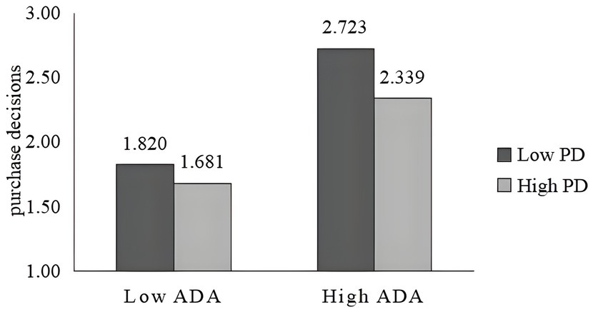 To visualize the moderating effect of power distance, the moderating effects of power distance on self-efficacy and purchase decisions are plotted in Figures 5, 6. Consumers with low power distance perceive that algorithmic decision autonomy can bring them ease of decision-making, and do not experience algorithmic decision aversion even when the level of algorithmic decision autonomy is high. Whereas, people with high power distance have more status (Kim and Zhang, 2014) and self-confidence and focus on their emotional self-evaluation of being accepted by society so that when the level of algorithmic decision autonomy is high compared to those with a low power distance sense will instead cause them to lose their level of self-determination evaluation, reduce their self-efficacy, and negatively affect the purchase decisions. Also, it can be seen from the figure that algorithmic decision-making varies more with different degrees of autonomy for consumers with low power distance perception. Consumers with low power distance had higher self-efficacy and purchase decision influence than those with high power distance at the same level of autonomy.