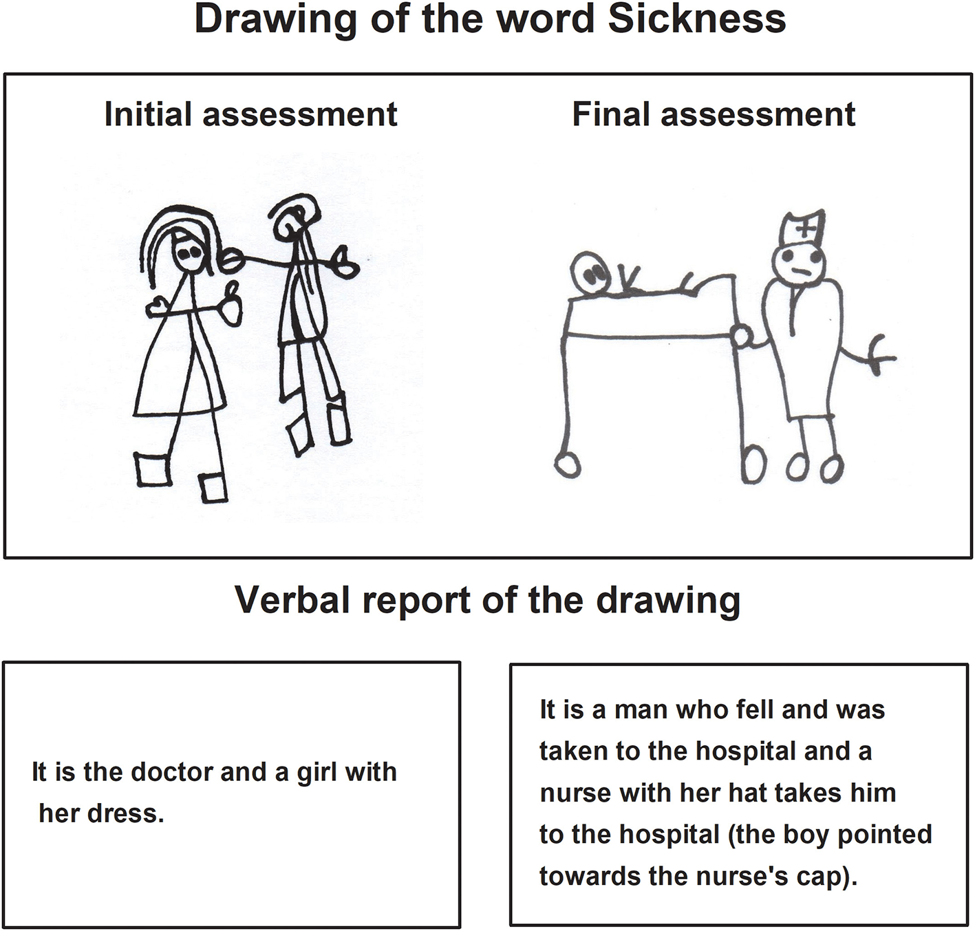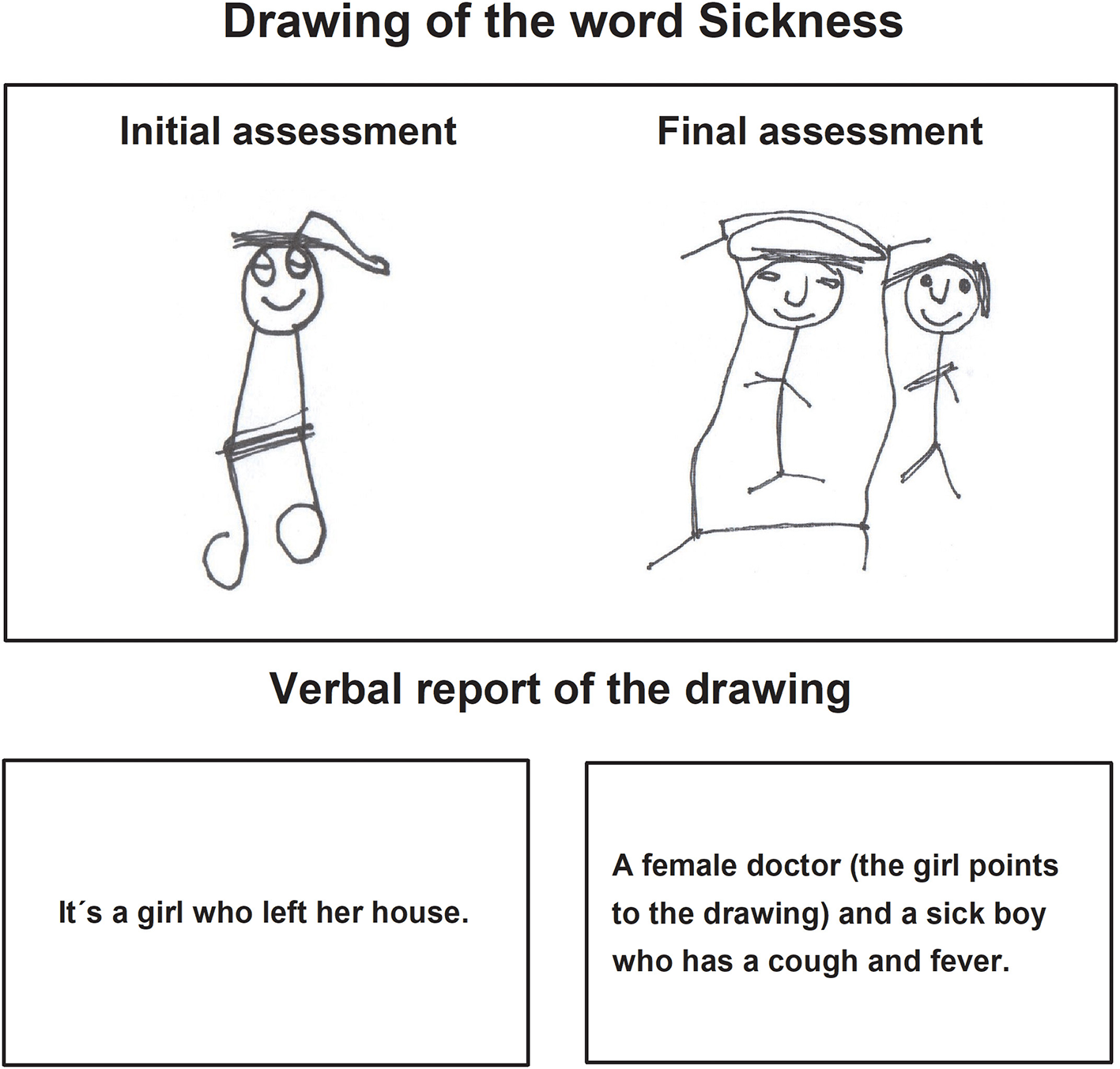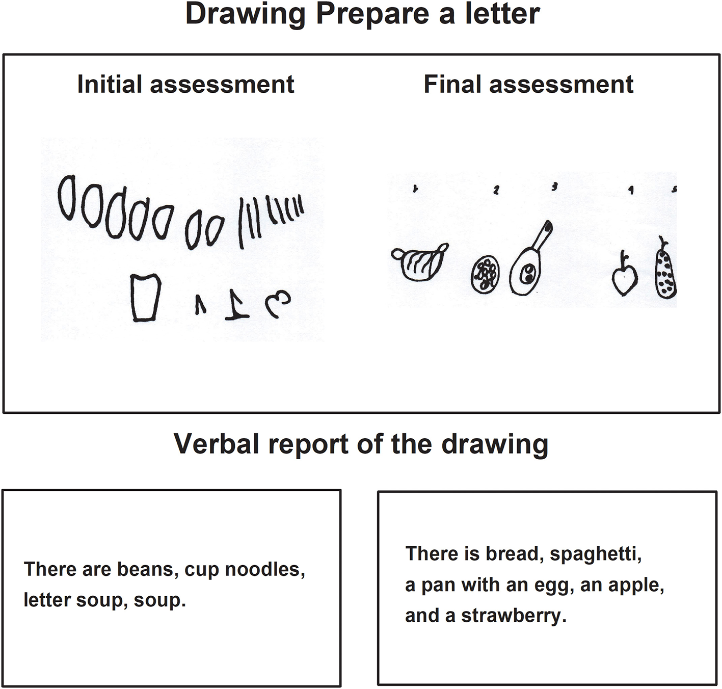 The verbal report of the children about their drawings of the final assessment expressed complete sentences integrating mainly nouns and verbs. The stories were related to the instructions indicated by the evaluator.