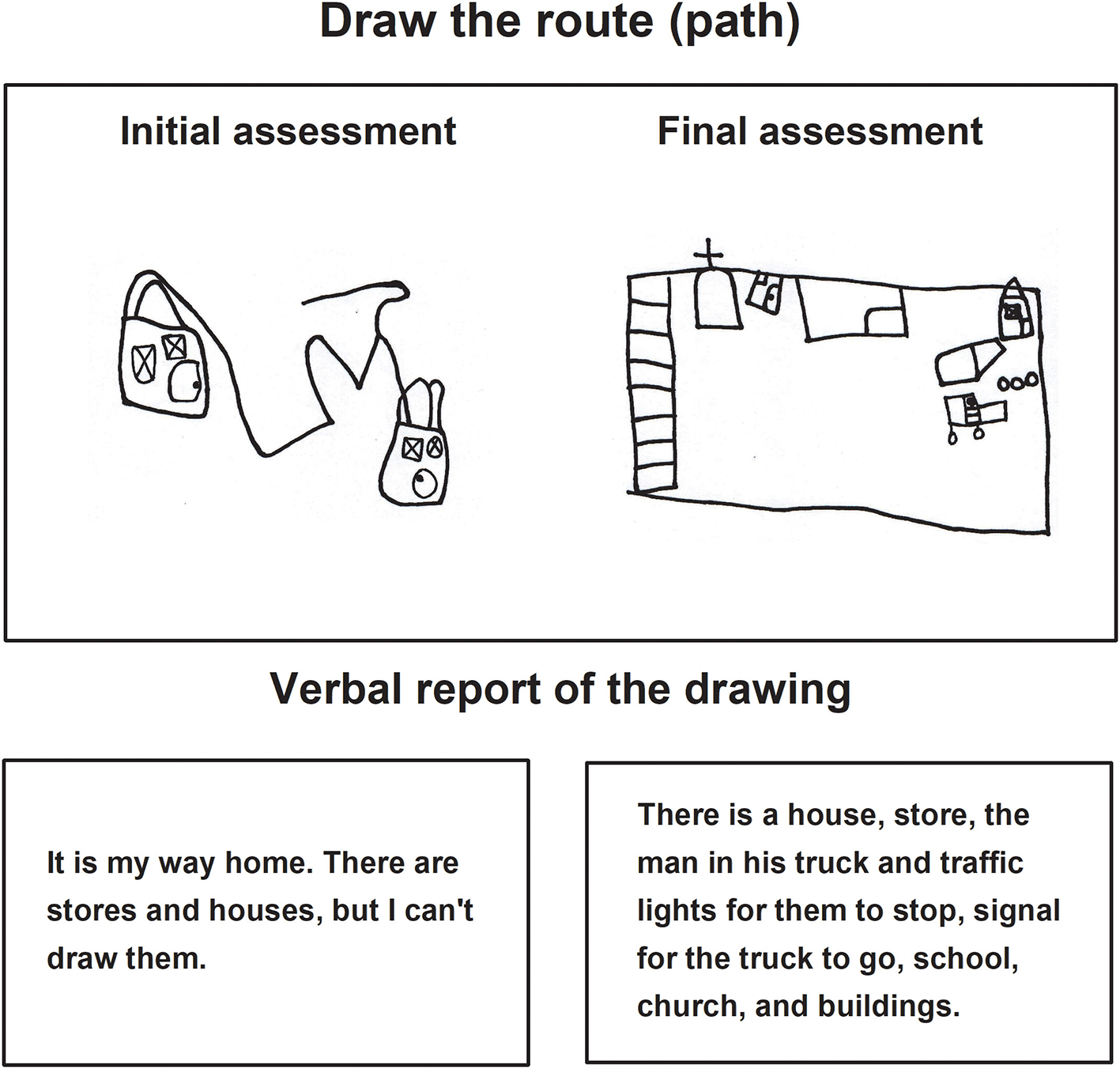 | 3. Draw the route (path) | “Draw the route (path) from your home to the nearest store” • What did you draw? • Where you come from and where are you going? • How do you know where the route begins and ends? |