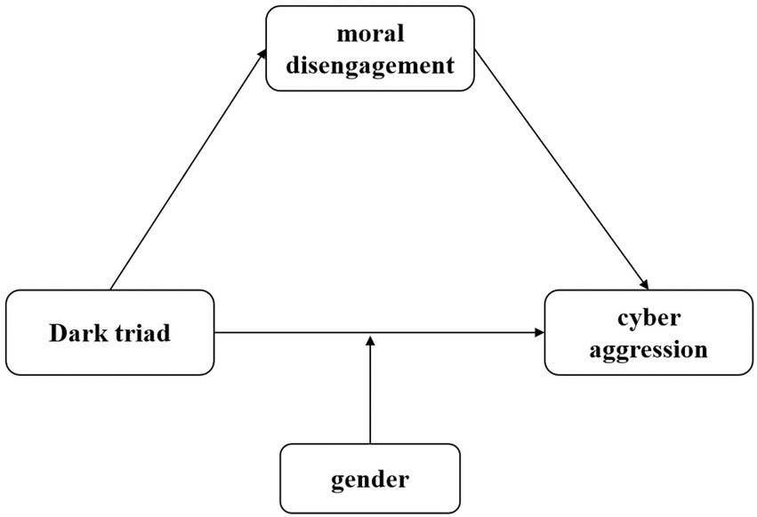 In previous studies, it has been noted that dark triad personality traits in adolescents correlate with their CA (Pabian et al., 2015; Moor and Anderson, 2019), but the potential psychological mechanisms involved have never been fully understood. Moral disengagement (MD) is one potential explanation for the proposed influence of dark triad characteristics on adolescents’ CA. MD is characterized by eight different cognitive mechanisms that enable individuals to violate internalized moral norms and to act unethically without guilt (Moore, 2015). According to social cognitive theory (SCT, Bandura 1989), individuals usually act in prosocial ways and avoid antisocial behaviors due to internal standards. However, people could adopt MD to rationalize their immorally acts, thereby reducing their negative self-judgment and guilty feelings (Bandura et al., 1996). Following this reasoning, numerous empirical and review studies had found that MD promotes various unethical behaviors in adolescents, including aggression, bullying, and cyber bullying (Killer et al., 2019; Bjärehed et al., 2020; Falla et al., 2021; Lo Cricchio et al., 2021). For example, a systematic review found that MD was significantly related to cyber bullying even after the roles of moderating variables were controlled (Lo Cricchio et al., 2021). Thus, MD in adolescents would be speculated as positively associated with their CA.