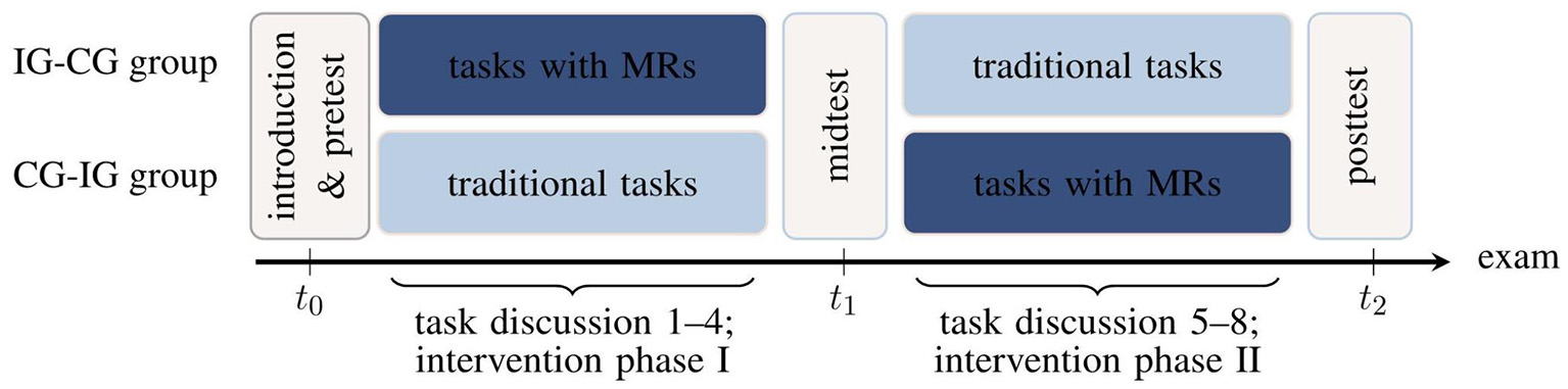 Study design with timeline from left (t0) to right (t2; intervention group IG, control group CG, multiple representations MRs). The designations “IG-CG group” and “CG-IG group” refer to the chronological order of the groups in the rotational design (first intervention group, then control group, or vice versa).