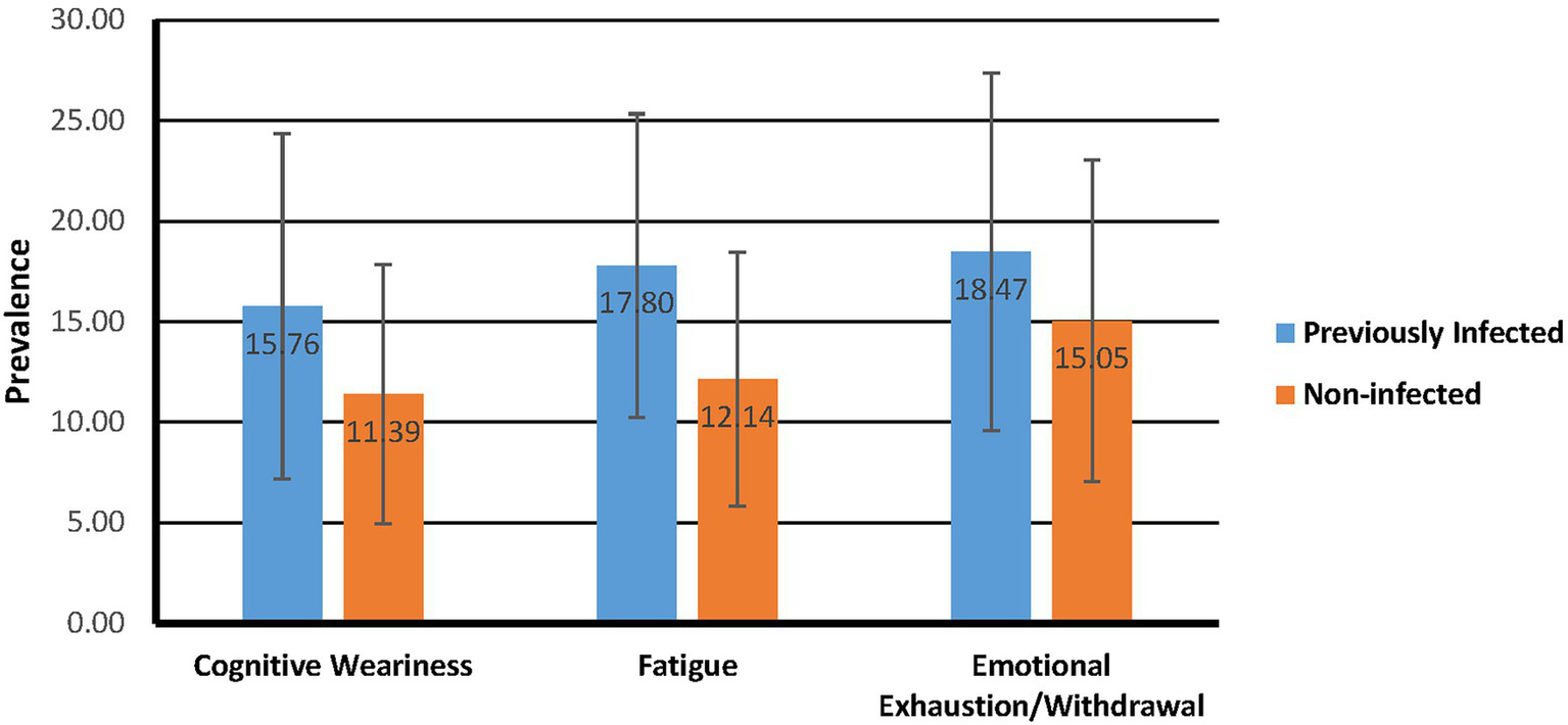 Participants who have been infected with SARS-CoV-2 reported significantly higher levels of burnout, anxiety, depression, and stress than those who have not been infected. While Emotional Exhaustion and Withdrawal were the most prevalent among both previously infected and non-infected groups, the most significant difference was the level of fatigue experienced. Brusaferri et al. (2022) found that the chronic stress of COVID-19 lockdowns may have caused neuroimmune activation in infected and non-infected individuals. Neuroinflammation can trigger symptoms such as mood alterations, mental and physical fatigue, discognition or “brain fog,” depression, and social withdrawal (Li et al., 2017; Brusaferri et al., 2022). Generally, burnout is caused by prolonged exposure to work-related stress (Koutsimani et al., 2019; Schaufeli, 2021). Interestingly, patients who suffered from long-COVID-19 were more likely to experience burnout (Selvaskandan et al., 2022). Coleman (2022) stated that long-COVID-19 can present similar symptoms to burnout and requires a different intervention approach. COVID-19 presented an unprecedented challenge to individuals, which exhausted the availability of their psychological, social and physical resources. Since well-being relates to the availability of psychological, social and physical resources an individual needs during a particular challenge, it makes sense that patients whose resources were depleted could show symptoms of burnout (Dodge et al., 2012).
