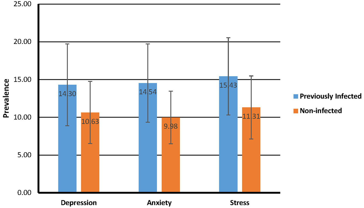 An independent-samples t-test was also executed to measure the differences in depression, anxiety, and stress among those previously infected with SARS-CoV-2 and the non-infected participants (Figure 3). Significant differences existed between participants who had been infected with SARS-CoV-2 and those who had not been infected, for all three DASS-21 scales: Depression [M difference = 3.66, SD difference = 0.44, CI = 2.79–4.54, t(451.33) = 8.26, p = 0.000], Anxiety [M difference = 4.56, SD difference = 0.41, CI = 3.76–5.36, t(430.40) = 11.25, p = 0.000], and Stress [M difference = 4.12, SD difference = 0.43, CI = 3.27–4.97, t(459.58) = 9.57, p = 0.000]. Cohen’s d indicated that increases were large (Depression = 0.76; Anxiety = 1.02, Stress = 0.88). The test’s sensitivity was, therefore, realistic at 95% power.