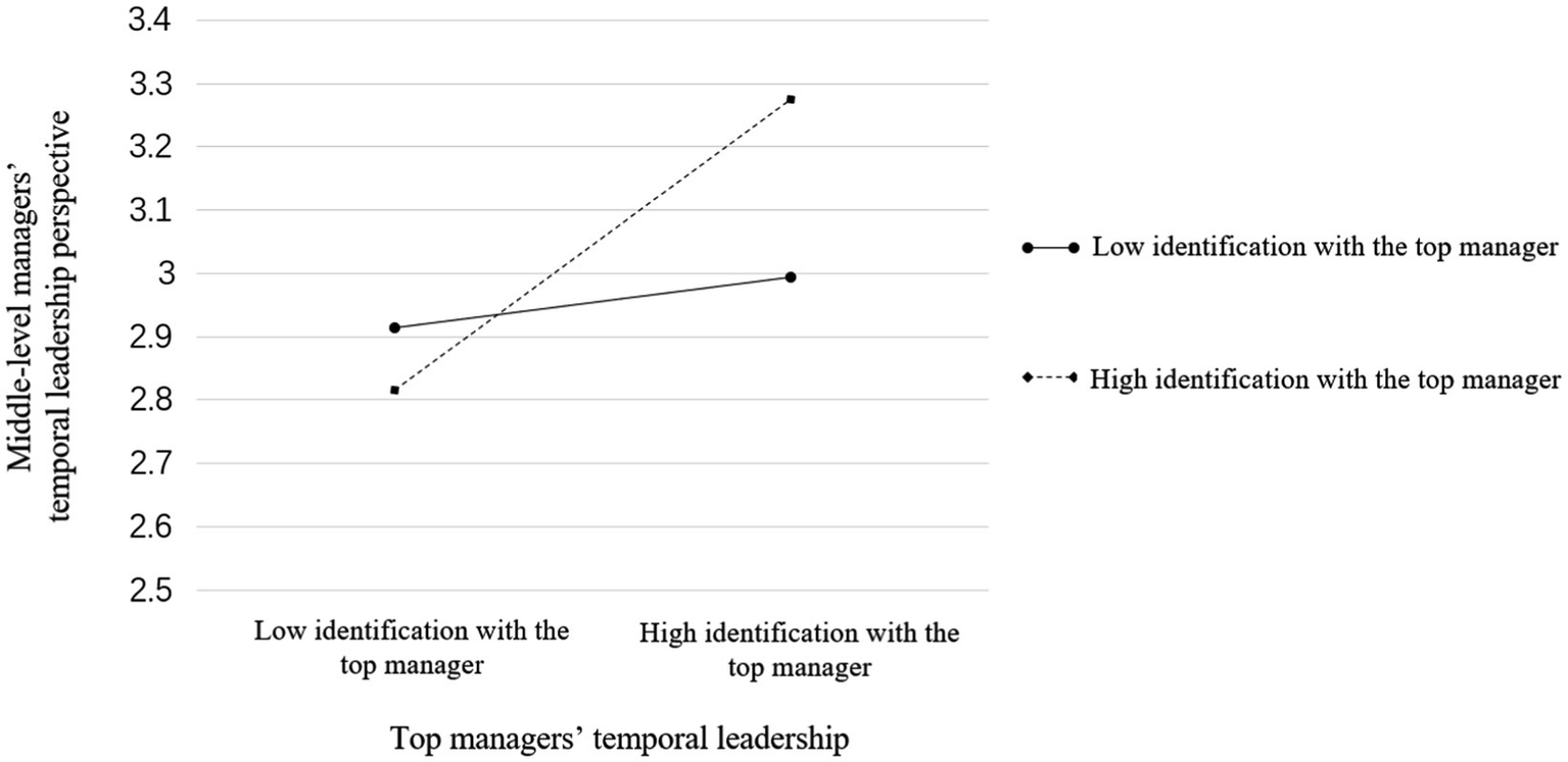 Hypothesis 3: Middle-level managers’ identification with the top manager moderates the relationship between top managers’ temporal leadership and middle-level managers’ temporal leadership perspective, such that the positive relationship is stronger when middle-level managers’ identification with the top manager is high rather than low.