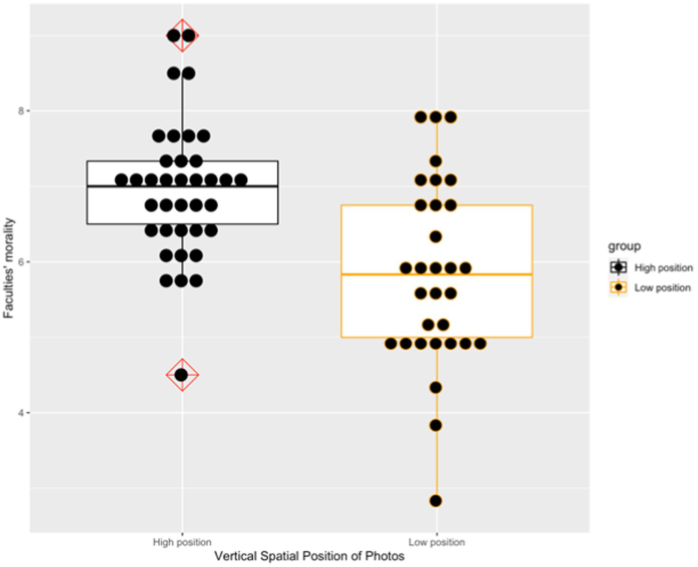 The male faculty was rated as more moral (t = 4.09, p < 0.001, Cohens’ d = 0.97) when his photo was projected on the upper part of the screen (M = 6.79, SD = 1.03) rather than the lower part of the screen (M = 5.59, SD = 1.41). Similarly, the female faculty was rated as more moral (t = 3.95, p < 0.001, Cohens’ d = 0.99) when her photo was displayed on the upper part of the screen (M = 7.10, SD = 0.93) rather than on the lower part of the screen (M = 6.09, SD = 1.12). By averaging each participant’s rating of the male faculty and the female faculty, the photos on the upper part of the screen (M = 6.95, SD = 0.92) were rated as significantly more moral (t = 4.29, p < 0.001, Cohens’ d = 1.03) in comparison with those on the lower part of the screen (M = 5.84, SD = 1.21). Figure 3 presents the boxplot of these two groups’ ratings about the faculty members’ morality.