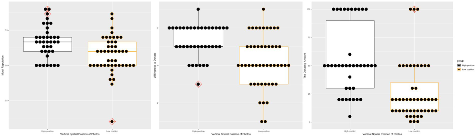 The donor recipient was rated as more moral (t = 3.45, p < 0.001, Cohens’ d = 0.76) when his/her photo was projected on the upper part of the screen (M = 6.67, SD = 1.14) rather than the lower part of the screen (M = 5.74, SD = 1.31).1 Comparatively, the participants were more willing to help the donor recipient when his/her photo was projected on the upper part of the screen rather than the lower of the screen (Mupper = 5.29, SD = 0.87; Mbottom = 4.23, SD = 1.39; t = 4.33, p < 0.001, Cohens’ d = 0.92). Besides, the participants were also willing to donate more money to the donor recipient when his/her photo was projected on the upper part of the screen rather than the bottom part of the screen (Mupper = 54.87, SD = 30.24; Mbottom = 25.54, SD = 25.10; t = 4.92, p < 0.001, Cohens’ d = 1.06). Figure 4 presents the boxplot of these two groups’ ratings about the donor recipient’s morality, willingness to donate, and the donation amount.