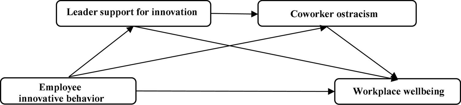 To reveal the relationship between employee innovative behavior and workplace wellbeing, drawing on social comparison theory and social exchange theory, this study introduces coworker ostracism and leader support for innovation as mediating variables to explore the bright side and dark side of the effect of employee innovative behavior on employees’ workplace wellbeing. This study chooses the two mediating variables for the following two reasons. First, coworkers and leaders play a vital part in the process of employees’ innovative behavior (Chiaburu and Harrison, 2008; Sijbom et al., 2015a,b). Second, employees, coworkers, and leaders belong to an organizational ecosystem (Neves and Cunha, 2017), where they interact frequently, spend a significant amount of their time at work, and are bound to influence one another to a certain extent. Specifically, this study argues that coworker ostracism is an important mediating variable between employee innovative behavior and workplace wellbeing. Because in modern society, where innovation is encouraged and competition is fierce, “shooting the top bird” has become one of the most common phenomena in the workplace. According to social comparison theory, members of the same team tend to compare themselves with their coworkers to determine their status in the organization. Therefore, employees’ outstanding innovative performance may cause their coworkers to reject them, which can adversely affect their wellbeing. Breidenthal et al. (2020) confirmed the dark side of creativity, that is, when employees demonstrate high creativity, they may cause jealousy and experience ostracism from coworkers, which may negatively affect their wellbeing. In addition, this study considers leader support for innovation as an important mediating variable between employee innovative behavior and workplace wellbeing. In a power hierarchy, employees rely on the leader for the information and support necessary to further develop after they implement innovative behaviors. A leader is a crucial party for employees to implement innovative behaviors (Kanter, 1988). Social exchange theory holds that individuals maintain an exchange relationship with others based on the principle of mutual benefit. This reciprocity principle, which is emphasized in social exchange theory, promotes the emergence of exchange. Employee innovative behavior is beneficial for not only promoting organizational performance but also improving the competitiveness of the organization. Consequently, according to social exchange theory, employees who engage in considerable innovative behavior are likely to receive innovation support from their supervisors, which can enhance their wellbeing. Furthermore, a leader has absolute power and status and is bound to exert a certain influence on the members of his/her team. Accordingly, the leader can use his/her power to minimize phenomenon such as exclusion by coworkers, which is not conducive to the development of the team. Therefore, this study suggests that leader support for innovation may also have an impact on coworker ostracism.