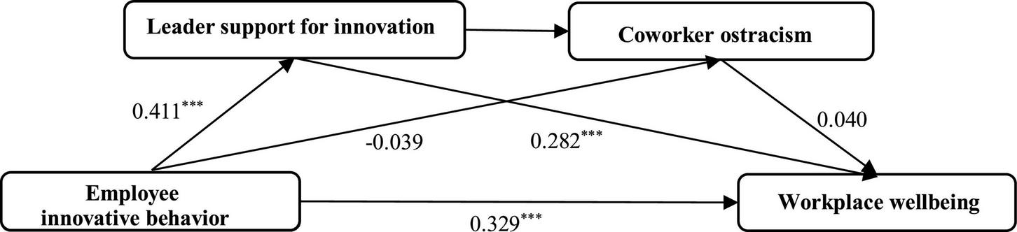 Hypothesis 4: Leader support for innovation and coworker ostracism play a chain mediating role in the relationship between employee innovative behavior and workplace wellbeing. In other words, leader support for innovation is negatively related to coworker ostracism, and employee innovative behavior is indirectly related to workplace wellbeing through the chain mediating path of “leader support for innovation–coworker ostracism.”