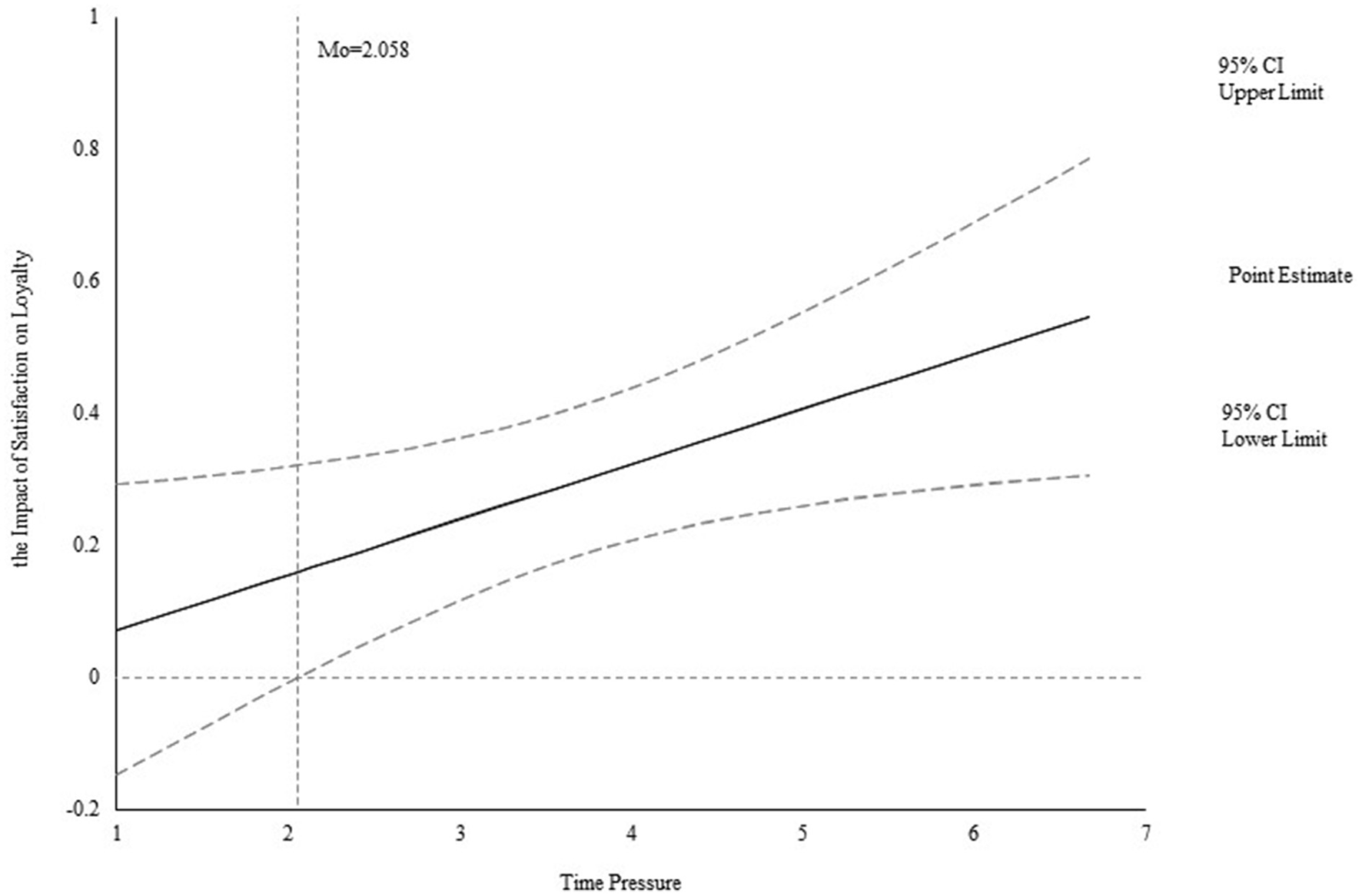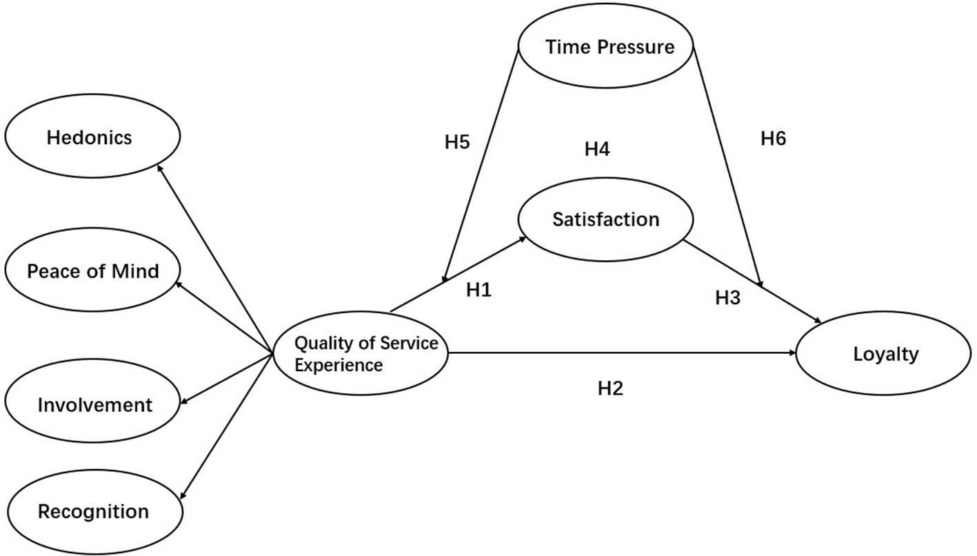 Time pressure as a moderator has been discretely implied in several studies. For instance, within a shopping environment, time pressure may affect the relationship between emotions and impulse buying as a moderator (Sohn and Lee, 2016) and moderate the relationship between shopping motivations and commercial activities (Lin and Chen, 2013). Additionally, in a working environment, time pressure moderates the relationship between client preference and information research (Ewing and Spilker, 2021). In summary, time pressure shows a moderating effect in cases where the independent variable influences the dependent variable. However, there is little research to study time pressure as a feeling that moderates both the relationship between QSE and satisfaction and the relationship between satisfaction and loyalty. Therefore, the following hypotheses are proposed: