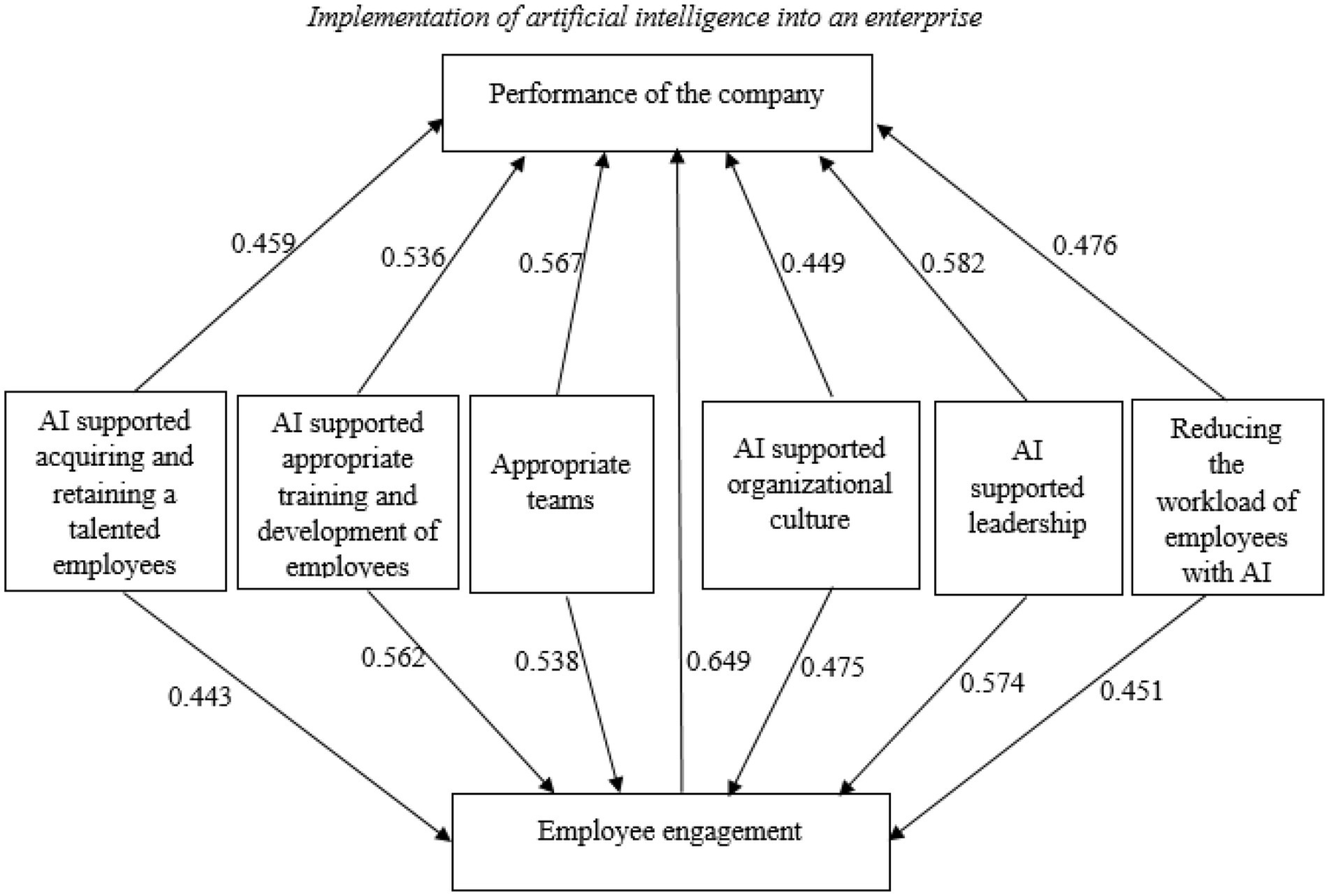 AI has an increasing effect on the economy and presents a new dimension of business. Slovenian enterprises need to take a step forward in using artificial intelligence, both in supporting business and production processes and in upgrading the products and services themselves. The implementation of artificial intelligence requires the transformation of the entire enterprise, which manifests itself through organizational culture, new management methods, new employee training methods and the creation of new enterprise strategies. The problem of implementing artificial intelligence is also manifested in the fact that enterprises should change the way their employees work. The goal of artificial intelligence is to optimize, automate, or offer decision support in the enterprise. Artificial intelligence increases productivity, and pave the way for new products. All this can lead to a change in the way people do their work. Thus, enterprises will need to carefully analyze expected outcomes and prepare plans to adjust their workforce capabilities, priorities, goals and jobs accordingly. Thus, managing artificial intelligence models requires new types of work skills. Based on this, we developed a multidimensional model with key constructs that are important in implementing artificial intelligence in the enterprise to increase employee engagement and performance of the enterprise (Fountaine et al., 2019). Also, we formulated two research questions: (1) Are there positive effect of key constructs that are important in implementing artificial intelligence in the enterprise (AI supported acquiring and retaining a talented employees, AI supported appropriate training and development of employees, appropriate teams, AI supported organizational culture, AI supported leadership, reducing the workload of employees with AI; Shanmugam, 2015; IBM, 2018; Hunt, 2021) on performance of the enterprise? and (2) are there positive effect of key constructs that are important in implementing artificial intelligence in the enterprise (AI supported acquiring and retaining a talented employees, AI supported appropriate training and development of employees, appropriate teams, AI supported organizational culture, AI supported leadership, reducing the workload of employees with AI) on employee engagement?