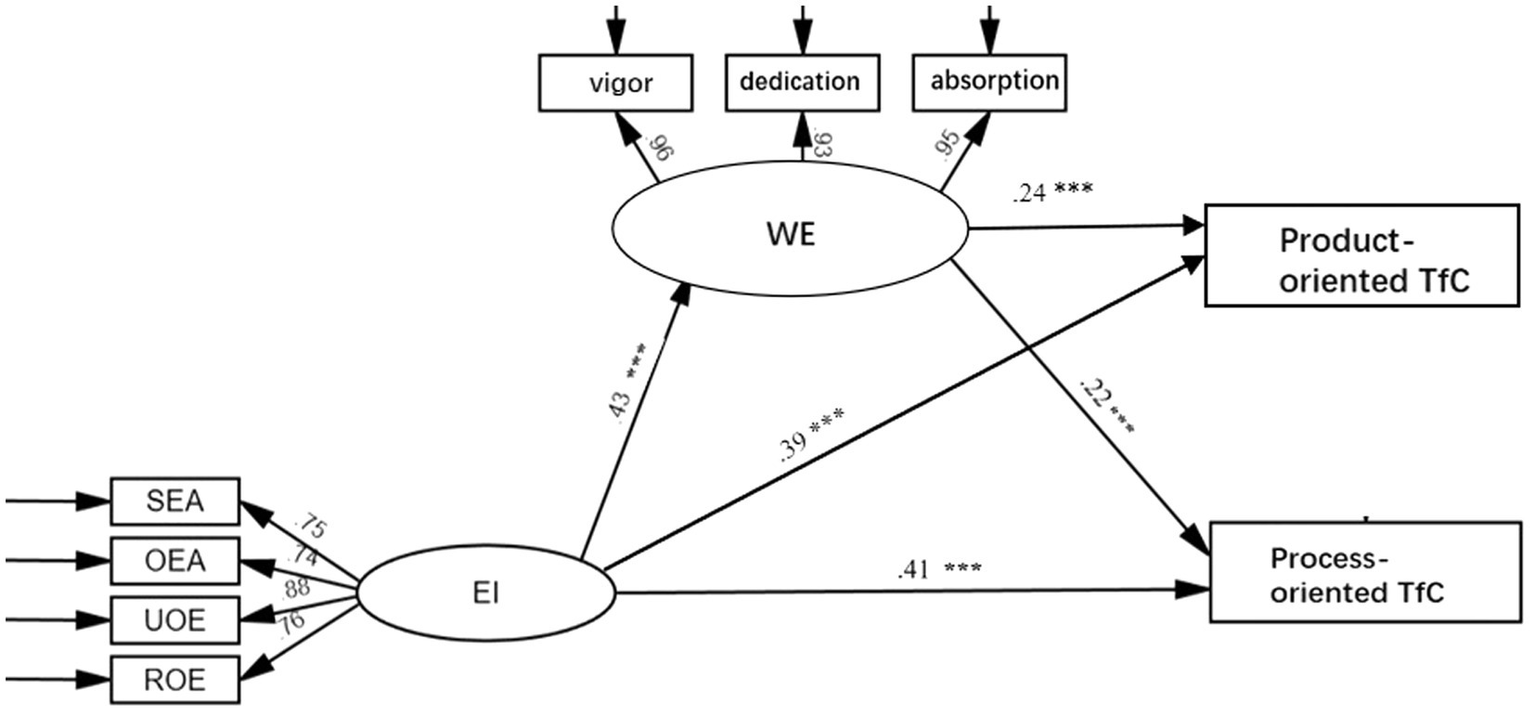 Structural model of the relationships among EI, WE and TfC. (Standardized regression weights are reported). *p < 0.05, **p < 0.01, ***p < 0.001.