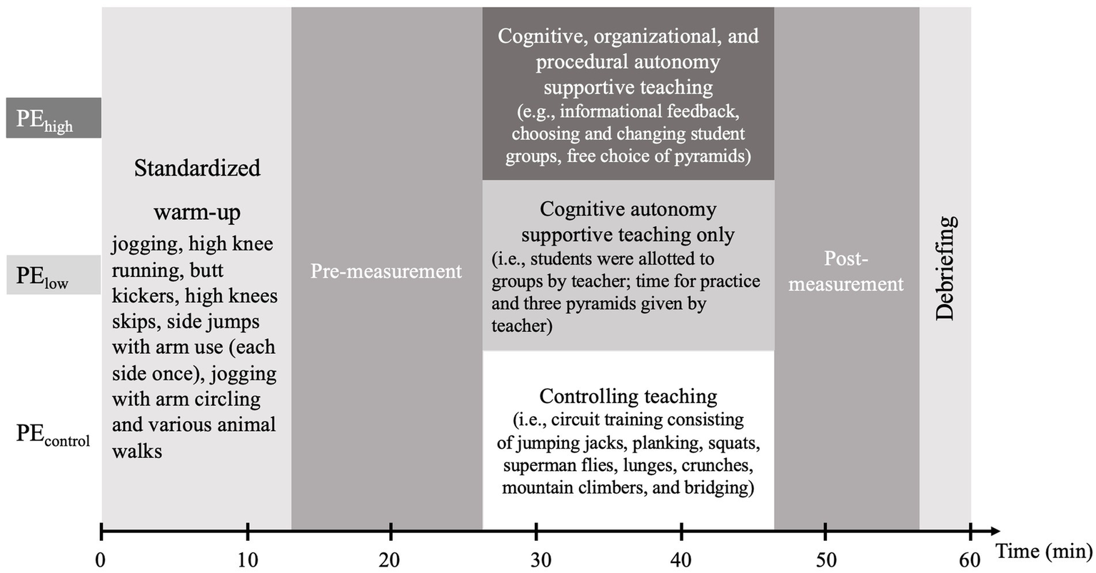 • Offering cognitive autonomy support: students in PEhigh could directly ask for feedback when needed; the teacher used non-controlling language (e.g., “Take your time. Normally, student groups practice about 5 min per pyramid. Check it out!”).