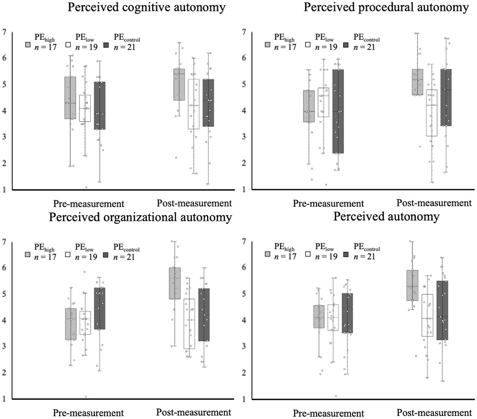 Figure 2. Boxplot charts show distribution of data points at pre- and post-measurement for perceived autonomy support—cognitive, procedural, organizational autonomy support, and total score of perceived autonomy support—in high (PEhigh), low autonomy-supportive (PElow) and controlling PE classes (PEcontrol). Single data points provided.