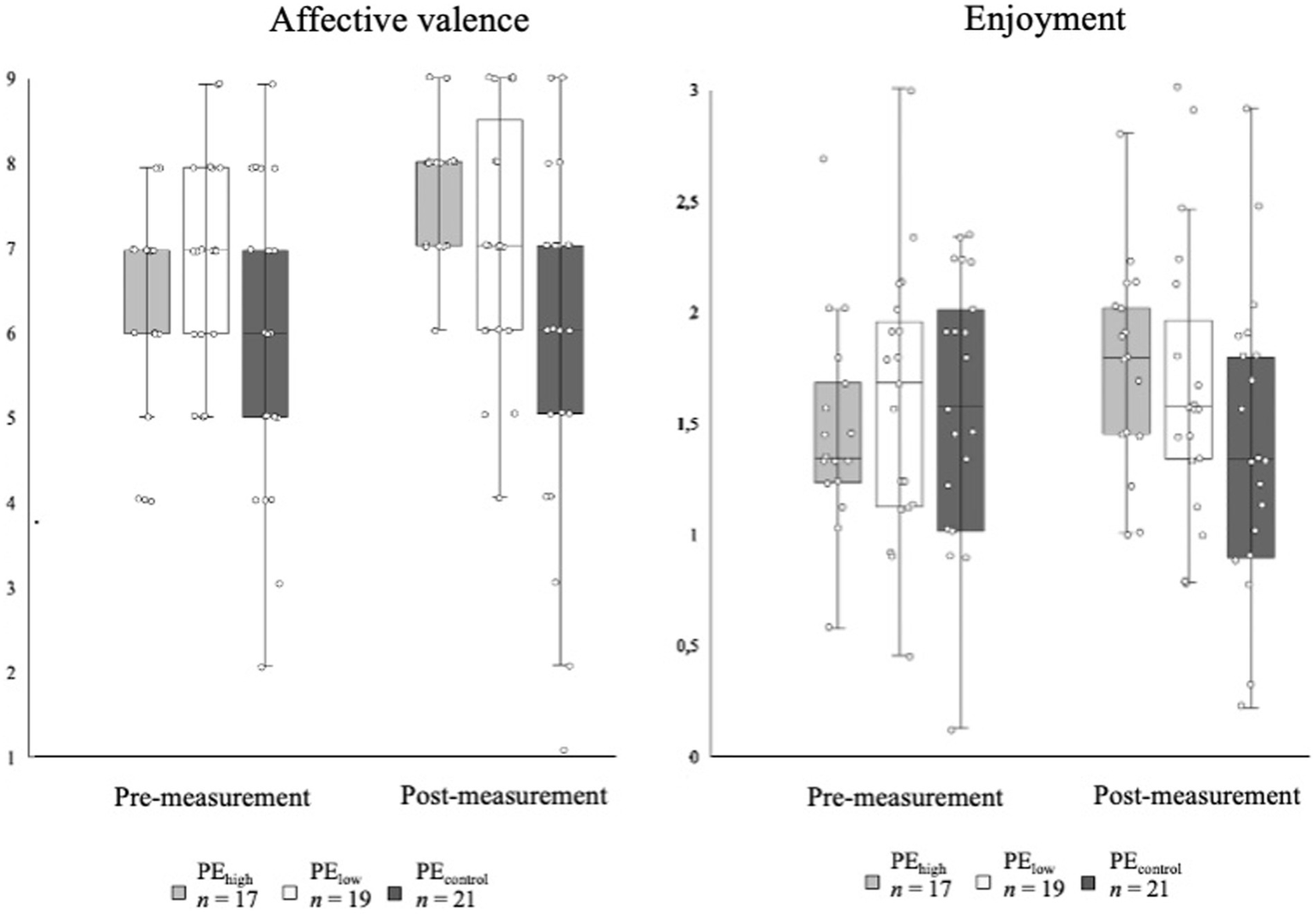 Figure 3. Outcome variables: Boxplot charts show distribution of data points at pre- and post-measurement for affective valence and enjoyment in high (PEhigh), low autonomy-supportive (PElow), and controlling PE classes (PEcontrol). Single data points provided.