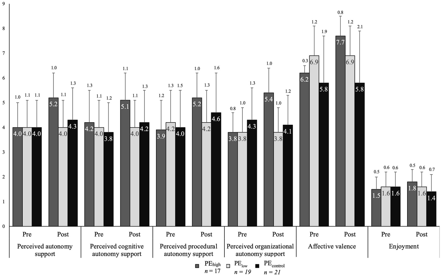 Figure 4. Descriptive mean comparisons (columns) with standard deviations (whiskers) of perceived autonomy support, cognitive autonomy, procedural autonomy, and organizational autonomy as well as affective valence and enjoyment in the three different PE classes (PEhigh, PElow, PEcontrol) at pre- and post-measurement.