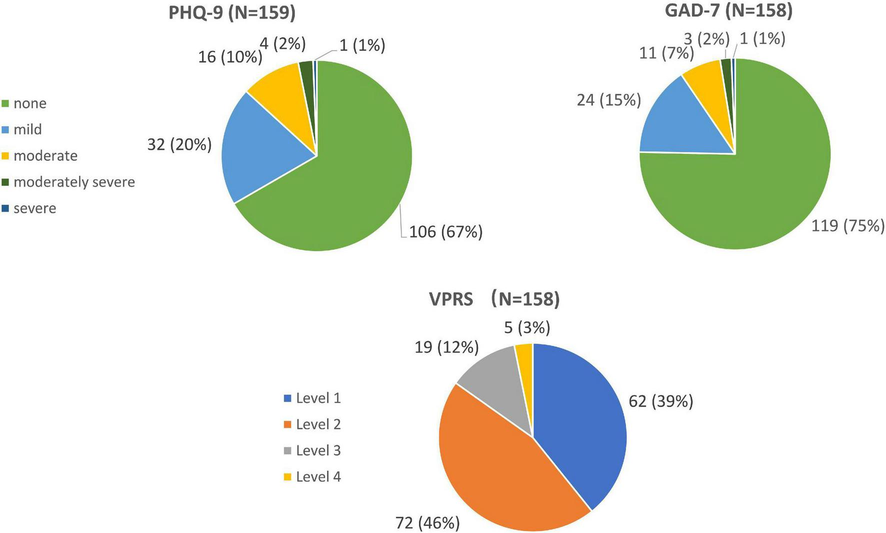 Patient Health Questionnaire-9 (PHQ-9) (Yu et al., 2012): As a simple and effective self-rating scale, the PHQ-9 is commonly used as an additional diagnostic tool for depression and as a symptom severity assessment tool for outpatients in general hospitals. The internal reliability of the Chinese version of the PHQ-9 was excellent (Cronbach’s α = 0.86) (Wang et al., 2014). The nine items on the PHQ-9, which are rated on a 4-point scale (0 = not at all to 3 = nearly every day) in the previous 2 weeks, are based on depressive symptomatology for the diagnostic criteria in the fourth edition of the Diagnostic and Statistical Manual of Mental Disorders (DSM-IV) in the United States. Depression severity was scored: 0–4 none, 5–9 mild, 10–14 moderate, 15–19 moderately severe, and 20–27 severe.