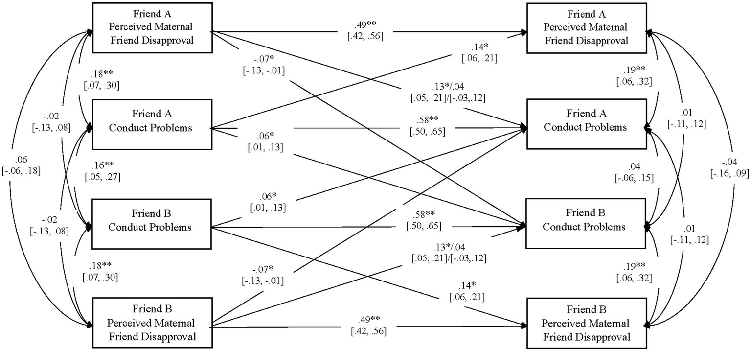 We expected to replicate previous findings of friend influence over conduct problems and emotional problems (Giletta et al., 2021), such that greater levels of adjustment problems on the part of one friend should lead to increases in the same on the part of the other friend. Consistent with results from previous studies, we expected that mothers would respond to adjustment problems in their own children by increasing efforts to manage friendships (Tilton-Weaver and Galambos, 2003). We suspected that mothers would express disapproval when confronted with adjustment problems among the friends of their children, but given the level of ignorance that many parents have about the affiliates and activities of their offspring (e.g., Yang et al., 2006), we were not confident that reliable associations would emerge. We did not advance specific hypotheses about the adjustment consequences of maternal disapproval of friends. Clearly, parents intend for their efforts to mitigate child problem behaviors, but some studies find that they have the opposite effect (Keijsers et al., 2012; Xiong et al., 2020). Should mothers succeed in disrupting interactions with friends, then we would expect that the friends of their children would benefit; here too, we recognized the possibility of iatrogenic effects.