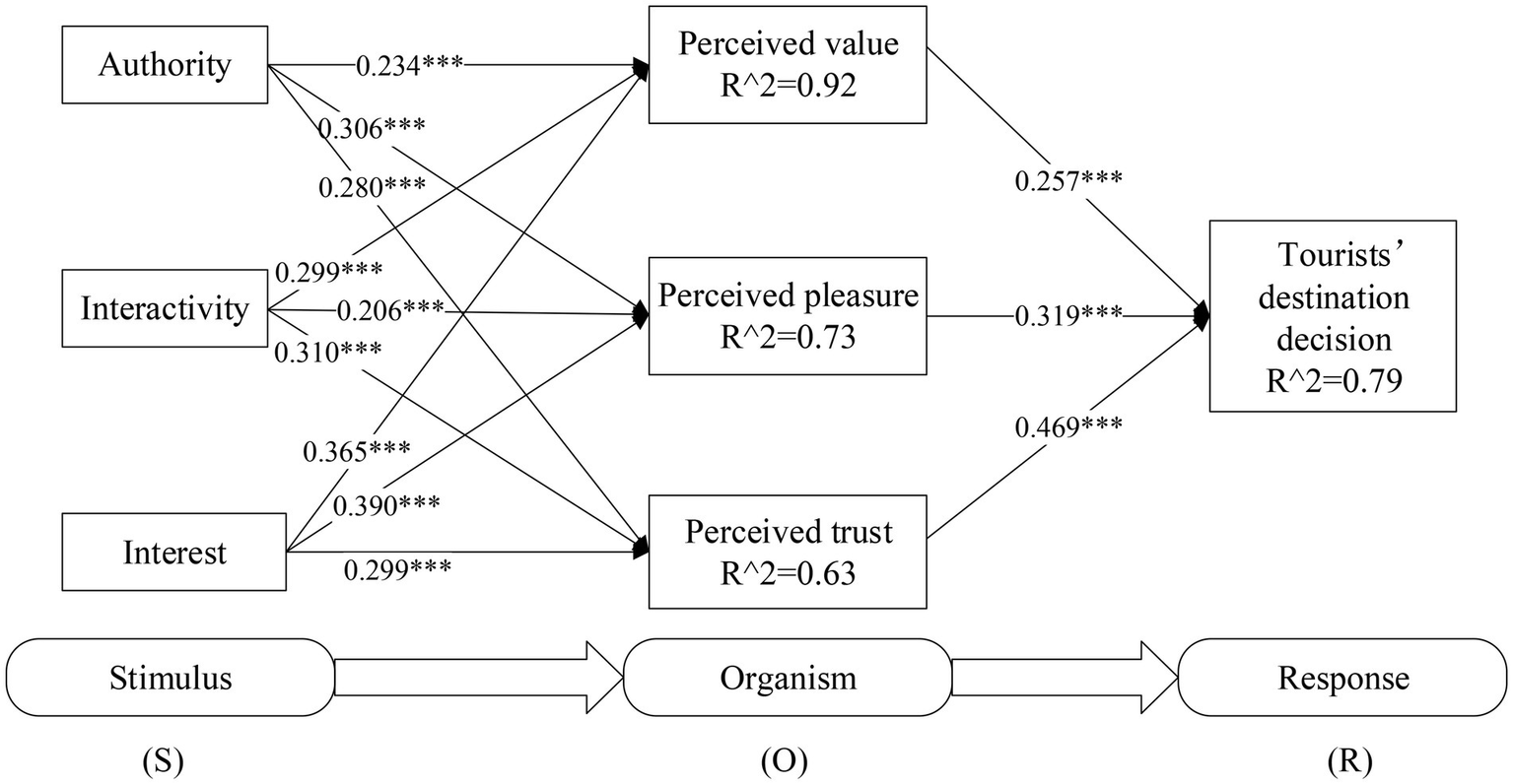 The structural equation model of official promotion short videos’ influence on tourists’ destination decision based on the SOR theory.