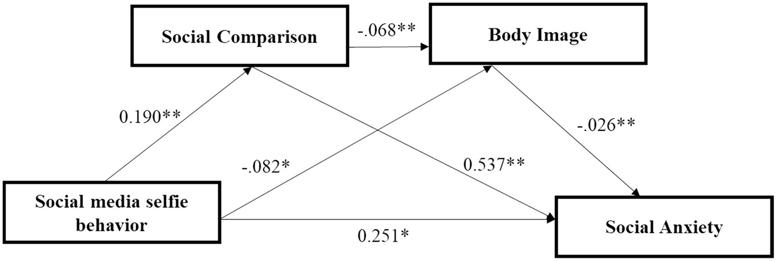 However, with the immersion, popularity and anxiety brought about by the phenomenon of selfies, the social problems resulting from the image of an individual’s appearance and related body perceptions have proliferated, not only affecting the formation of immature esthetics and aberrant psychology in youth group, but also leading to reduced well-being among family parents and children, negative body satisfaction and negative social psychology, among others (Verduyn et al., 2015), which has sparked widespread concern in the community. According to the social comparison theory proposed by Festinger, the level of social media participation will cause individuals to have a high level of social comparison psychology, especially the self-representation behavior in social media will make individuals pay more attention to their appearance and others’ evaluation of their body condition, and individuals with a high level of social comparison psychology will affect the formation of negative body image, and thus individuals’ concerns about the negative evaluation given by others during the social process. This can lead to social anxiety due to concerns and fears about the negative evaluations given by others during social interaction (Festinger, 1954). In particular, the current global pandemic of Corona Virus Disease (COVID-19) that emerged in early 2020 is not over, with occasional outbreaks of various scales around the world, and the highly contagious nature of the virus has had a significant impact on people’s daily social lives. The Chinese government implemented strict universal travel restrictions in early 2020, including measures such as home quarantine, stopping offline teaching, and implementing online teaching, which severely affected the psychological and emotional well-being of the youth population (Wang and Zhao, 2020). In this social context, where social activities are gradually shifting to online media and people’s social connections are shifting from offline to online, it is common for people to feel nervous, anxious, or upset in the face of sudden lifestyle changes (Chen et al., 2020). Therefore, this study aims to investigate the social anxiety of a specific group of individuals online, to investigate the relationship between online specific self-representation behaviors and social anxiety, and to verify the serial mediation effects of social comparison and body image. By examining youth selfie behaviors and social anxiety, the relationship between individual social media selfie behaviors, body image, and social anxiety was clarified. The investigation of this study helps to theoretically clarify the underlying psychological mechanisms of how selfie behaviors affect social anxiety in youth group, and provides a theoretical basis for the prevention and intervention of adverse social emotions such as negative body perceptions in youth. The detailed discussion of the relationship between selfie behavior and social anxiety is an important issue of information communication effects in the post-industrial era, and this proposition is not only related to the development path of human mediated society, but also has its unique theoretical significance and practical value.