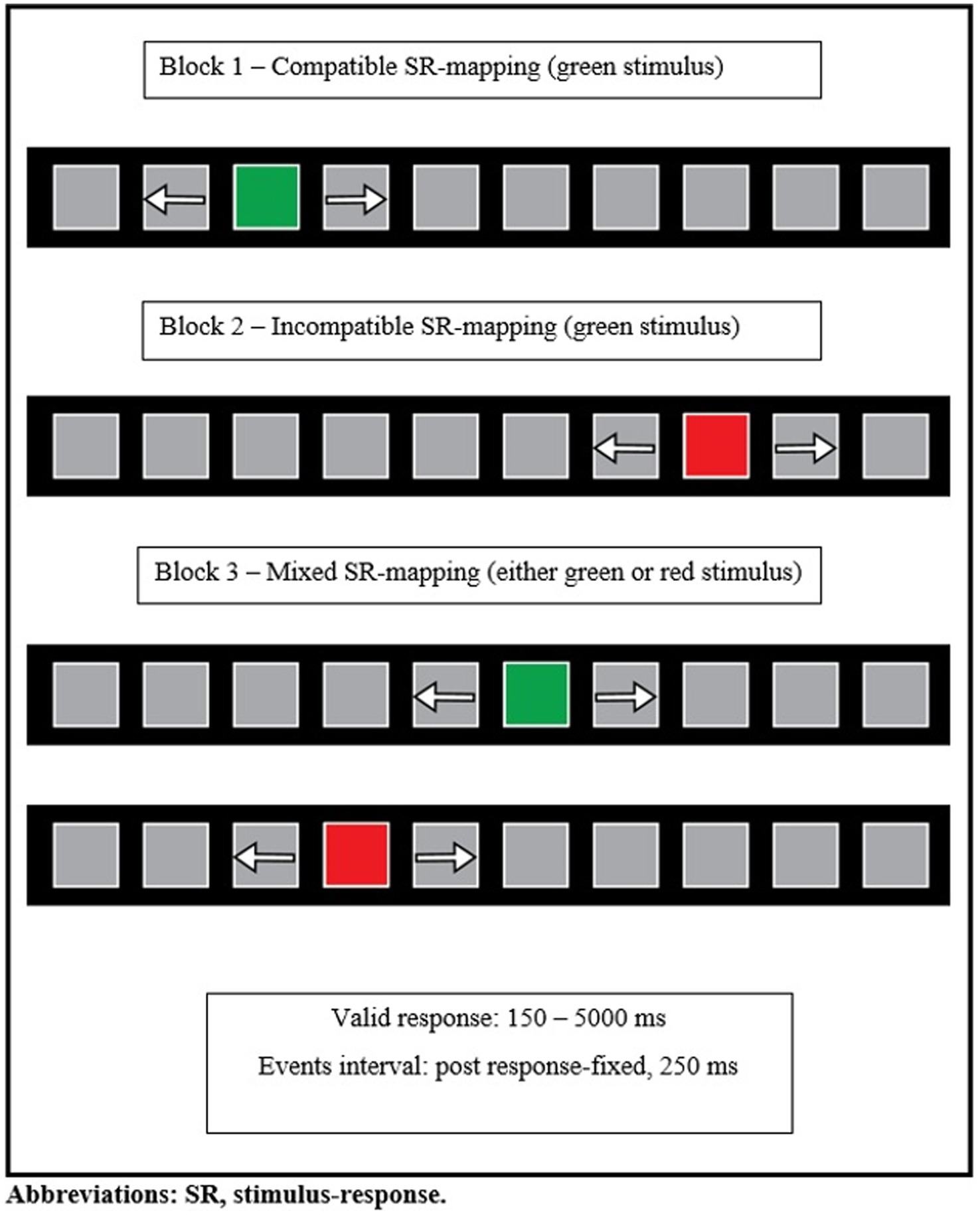 Mixed-block-design paradigms include repeated presentations of the same task (i.e., initially following one rule and then following another one), as well as shifts between tasks within the same block, (i.e., set-shifting between the two rules). Some of these paradigms include three blocks, as in the present study. The first block is compatible (responding to the side of stimulus presentation), the second is incompatible, while the third is mixed (either compatible or incompatible stimulus is presented). Mixed-block-design paradigms allow researchers to evaluate performance-cost in two ways: (a) by measuring the difference in speed and/or accuracy between the compatible block and the compatible trials of the mixed block, known as mixing-cost (Reimers and Maylor, 2005; Cragg and Chevalier, 2012) and, (b) by measuring the difference in speed and/or accuracy between the no set-shifting and the set-shifting trials within the mixed block, known as set-shifting-cost (Schmitter-Edgecombe and Langill, 2006). When measuring mixing-cost, an across-block comparison is conducted, whereas when measuring set-shifting-cost, a within-block comparison is conducted.