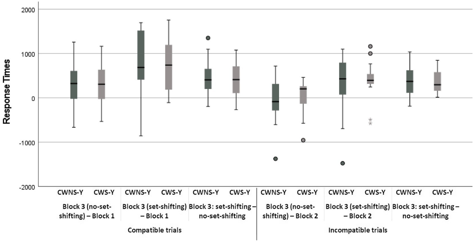 Therefore, the aim of the present study was to assess CF, more specifically set-shifting, within and across two classification groups (CWS and CWNS) and two age groups (younger and older). By having a wider age range (4–10 years) compared to that of previous studies, we were able to divide both classification groups into younger (CWS-Y and CWNS-Y: below 7 years; preschool-age children) and older subgroups (CWS-O and CWNS-O: above 7 years; school-age children) and conduct a cross-sectional study. This was to provide us with information as to how CF develops across this wider age-range. To measure CF, we did not only compare the compatible trials but, we also compared the incompatible trials. Even though, the standard measure of CF suggests comparing the compatible trials, we proceeded with also comparing the incompatible trials as an attempt to control for the effects of inhibitory control.