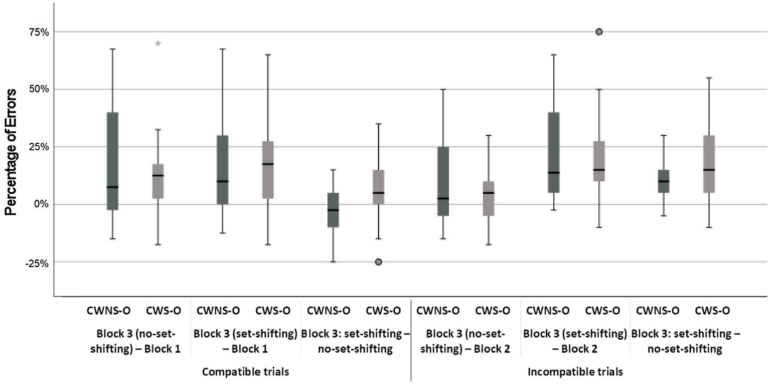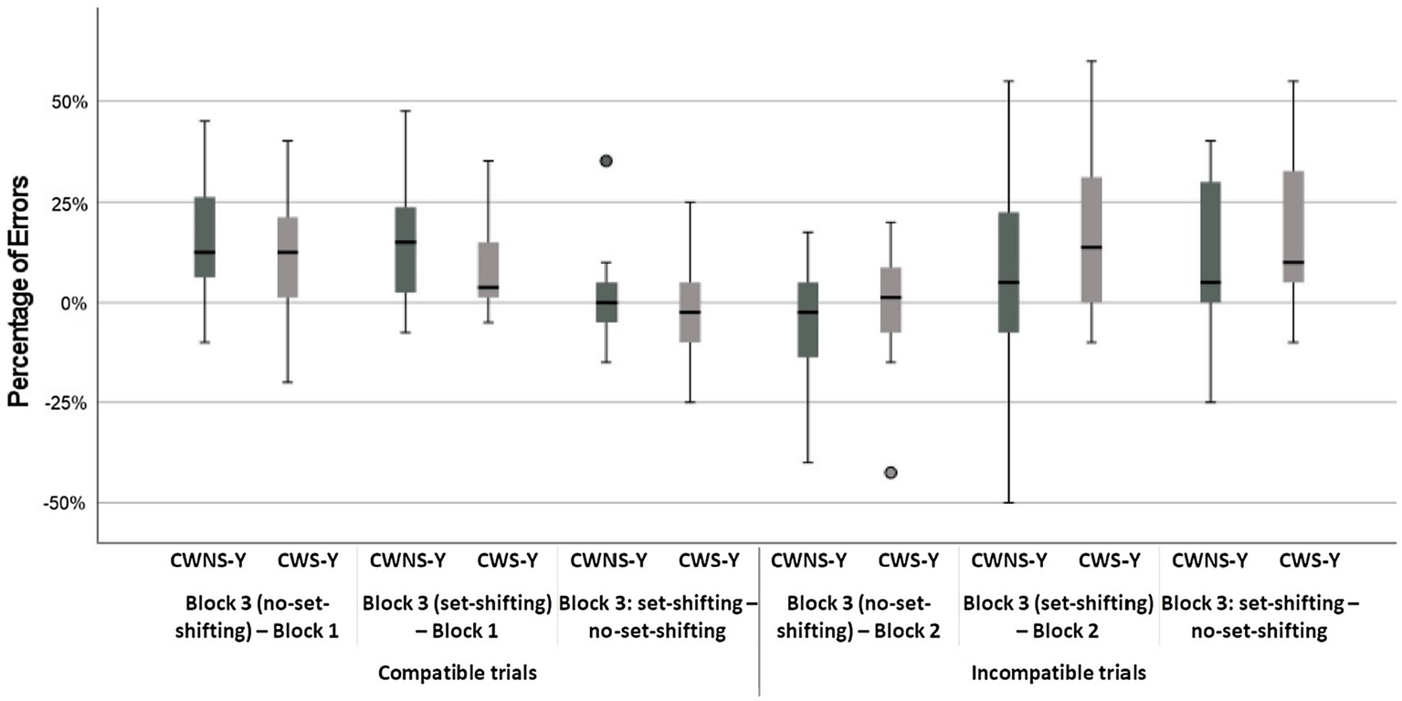In all the analyses, we hypothesized that there would be significant differences expressed in longer response times but not in more errors for the subgroups of CWS-Y, CWS-O and for the group of CWS. This finding is hypothesized to be more evident in the analyses of incompatible trials as it was earlier reported (Paphiti et al., 2022).