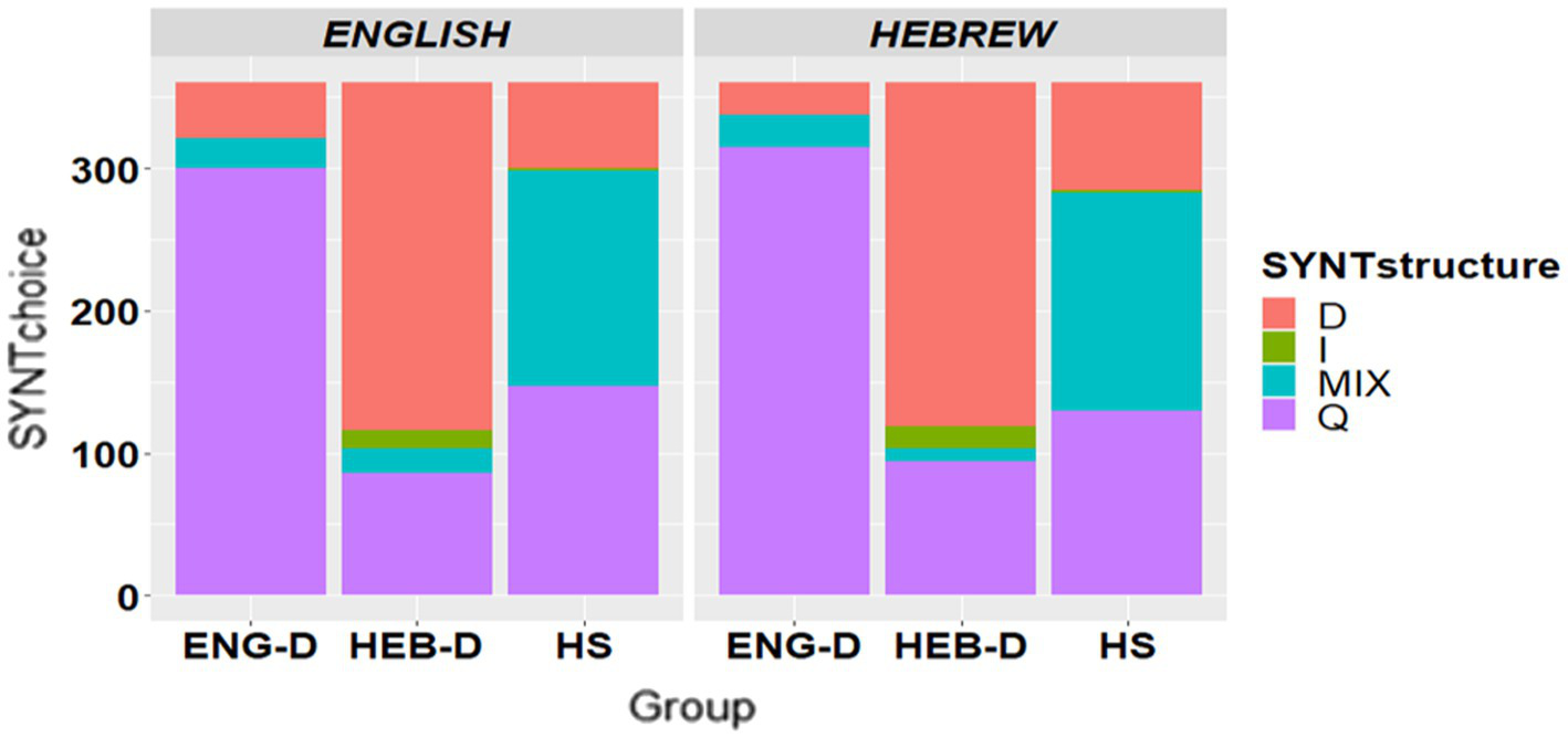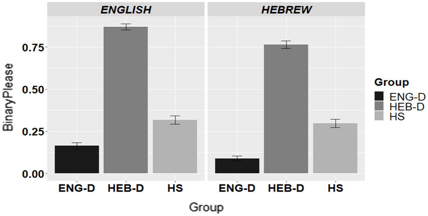 In order to determine to what extent request and apology strategies of HL-English speakers differ and/or resemble those of dominant speakers in HL-English and in SL-Hebrew, we fitted mixed-effects logistic regression models (Baayen et al., 2008) with lme4 package (Bates et al., 2015) since the responses were mainly coded in a binary manner (1 = present, 0 = absent), i.e., syntactic structure, the use of modals, the use of ‘please’/‘bevakasha’, the use of IFIDs, and the use of adverbial intensifiers. We tested the contribution of Language (English, Hebrew) together with Group (ENG-D, HEB-D, HS); these variables and their interactions were entered as fixed effects. To account for the variability within participants and scenarios, the models included crossed random intercepts for Participant and Scenario. Fitted models were compared in terms of Akaike Information Criterion (AIC) and Bayes Information Criterion (BIC), with reduced AIC and BIC values indicating a better model fit. This was supplemented by Likelihood ratio tests conducted to determine if the inclusion of a predictor significantly improved the model fit. First, we examined whether the inclusion of the random effects was permitted. This was done by comparing a baseline generalized linear model without the random intercepts (null model) with a baseline mixed-effects model that only included the random intercepts. Next, we implemented a step-wise-step-up procedure for building the mixed-effects model. The significance level of the main fixed effects was obtained using the ANOVA function. We obtained the estimated marginal means (EMM) for all pairwise comparisons using Tukey’s HSD adjustment for multiple comparisons. In the results subsection, we report the final models which were found to provide the best and most parsimonious fit for the data. We fitted linear models for the analysis of the number of propositions in apologies in English and in Hebrew, as the data were coded in a non-binary manner (0–4). We also ran models with ‘Social Status’ and ‘Social Distance’ as fixed variables, yet the inclusion of these effects and their interactions with Group did not improve the fit of the models. In the Limitations subsection, we outline possible reasons for that.