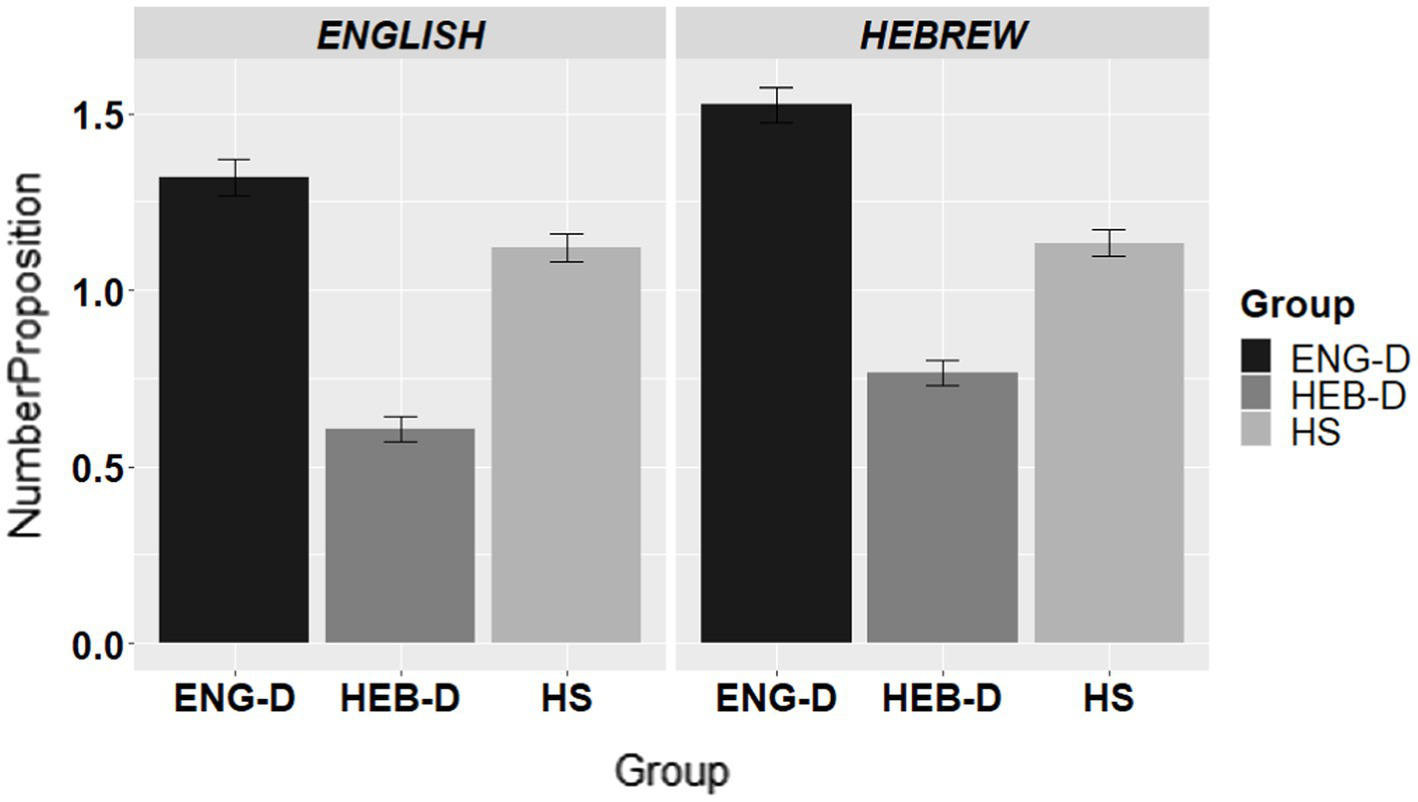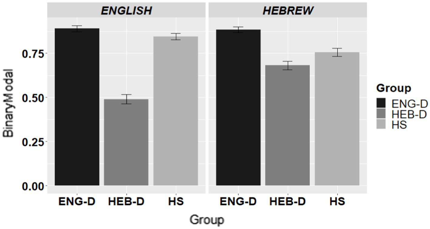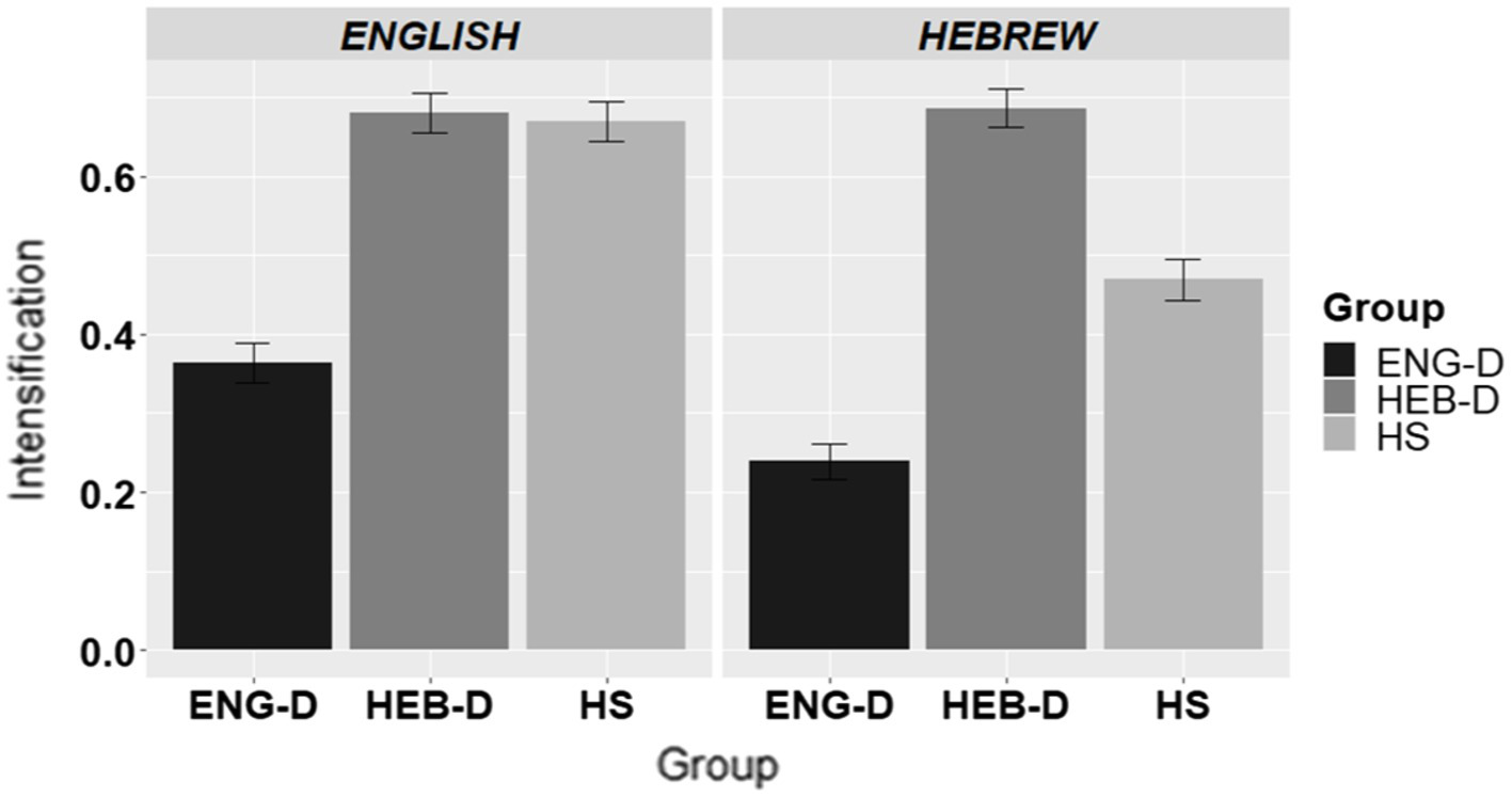 The study comprised three groups of adult bilingual speakers between the ages of 23–30: (i) HL-English bilinguals who were dominant in Hebrew, born to English-speaking families but raised in Israel from birth or arrived in Israel before the age of five (HS); (ii) Hebrew-dominant bilinguals, born to Hebrew-speaking families and raised in Israel, and thus English is the language of their schooling (HEB-D); and (iii) English-dominant bilinguals, born to English-speaking families and immigrated to Israel from an English-speaking country after the age of 18 (ENG-D). All groups were tested in both English and Hebrew. All three groups were balanced in regard to the number of participants and the gender, i.e., ten females and ten males were tested in each group (a total of sixty participants in the study). All participants were of medium to high socio-economic status as suggested by the level of their education. The minimum age of 23 was chosen in order to make sure that the participants in the ENG-D group would have sufficient amount of proficiency in Hebrew to complete the tasks.